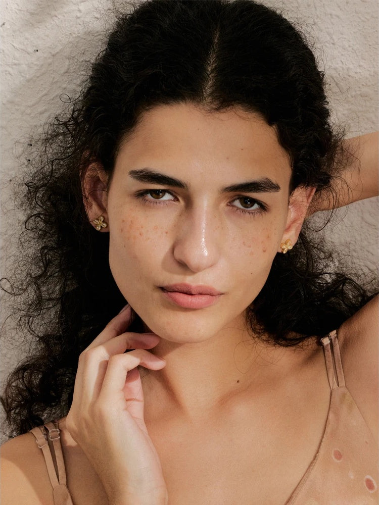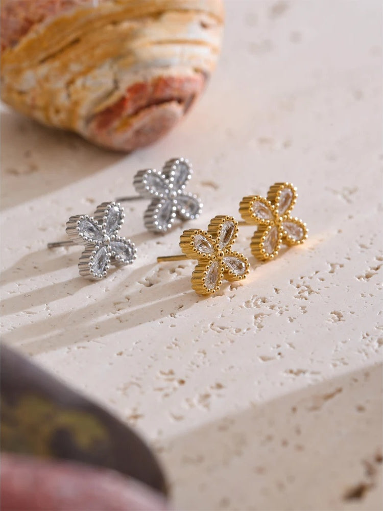 Delicately crafted small stud earrings feature a floral design accented with sparkling cubic zirconia stones. Made from waterproof stainless steel with a PVD real gold plated finish, these earrings offer durability and shine that lasts. The push-back closure ensures a secure and comfortable fit, making them ideal for everyday wear. Versatile and trendy, they complement a variety of styles with subtle elegance.