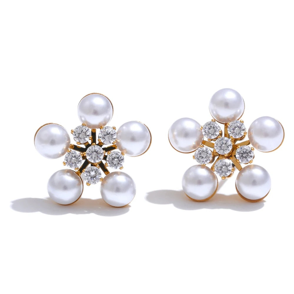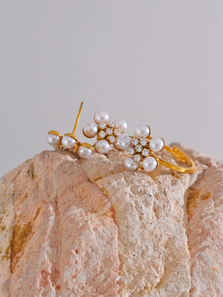 Bring fresh elegance to your everyday look with these flower stud earrings, thoughtfully detailed with lustrous simulated pearls and light-catching cubic zirconia. Crafted from durable stainless steel and finished with real gold PVD plating, they deliver the refined glow of gold-plated earrings in a design that feels timeless, feminine, and easy to wear.
