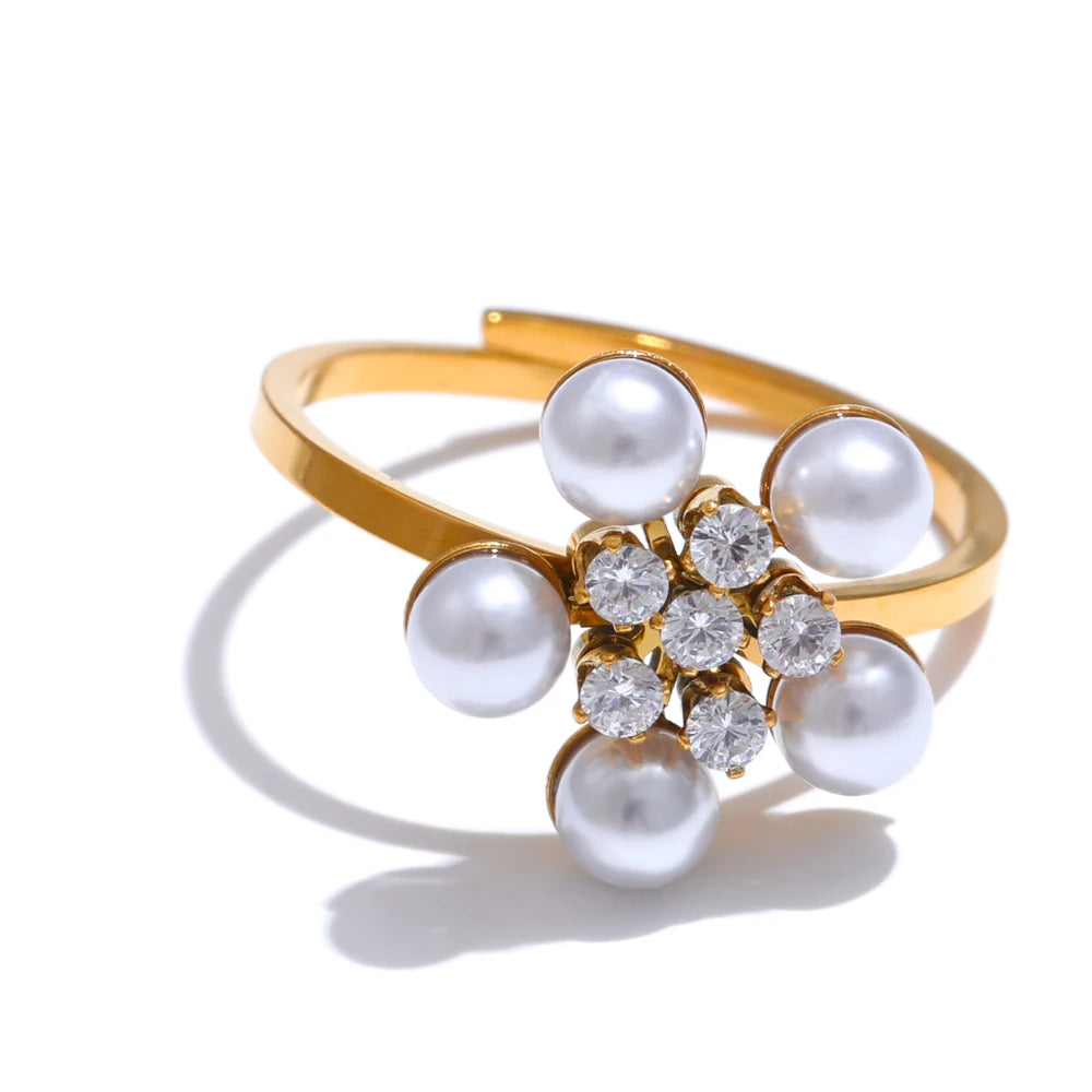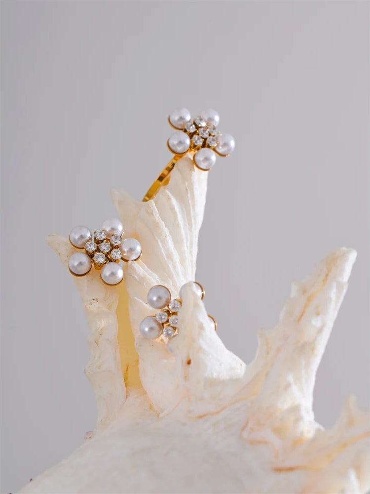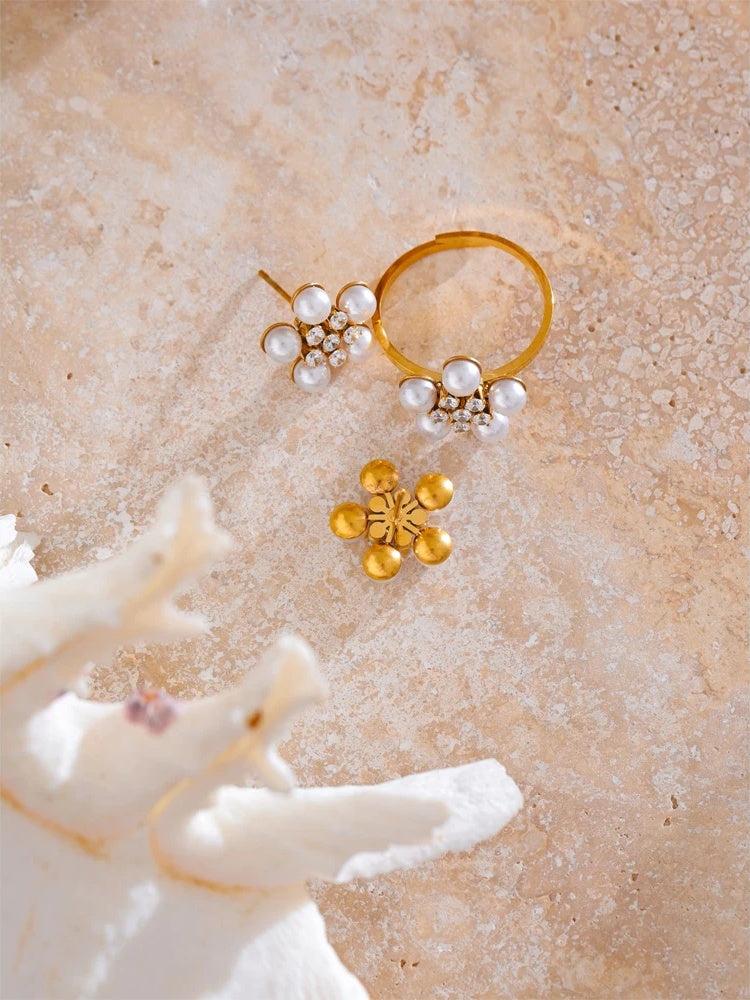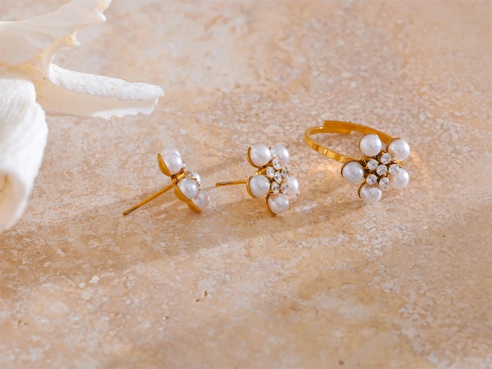 Cubic Zirconia Simulated Pearl Flower Stud Earrings Ring Set