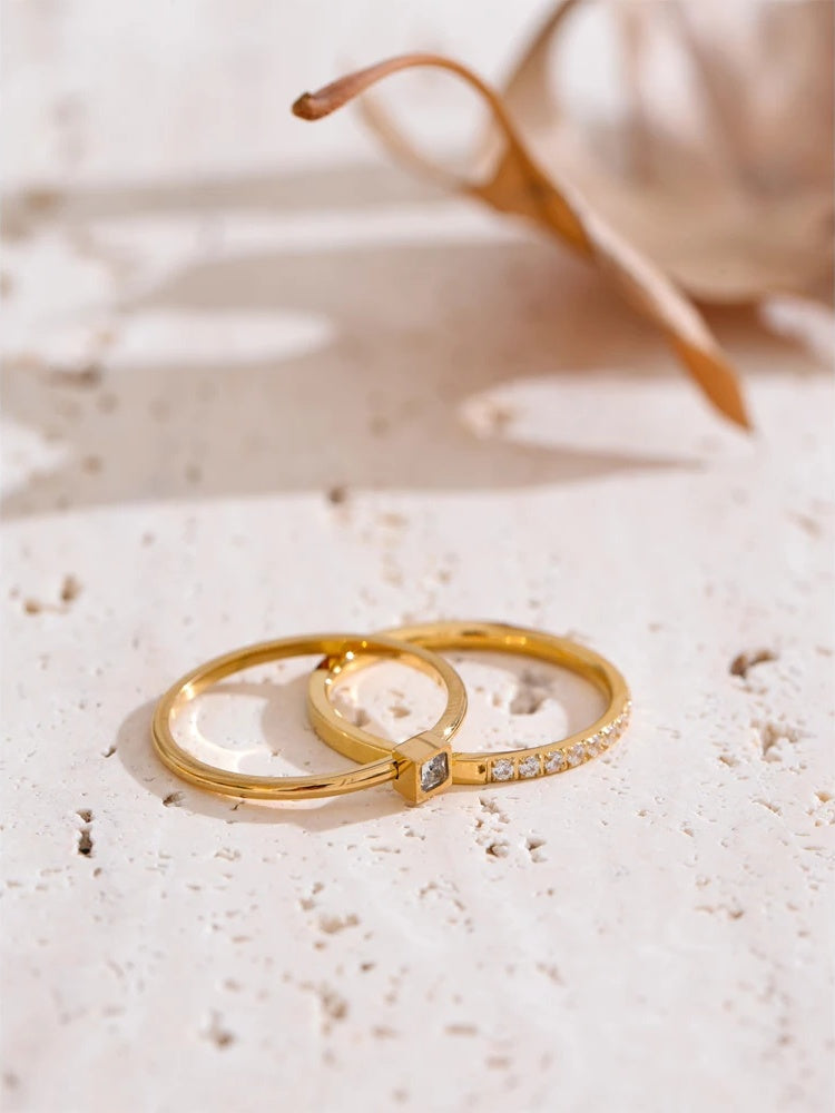 Crafted from stainless steel with an 18K gold PVD plating, this delicate ring set features high-quality cubic zirconia stones for a sparkling finish. The stackable design allows for versatile styling, perfect for mixing and matching or wearing alone. Lightweight and comfortable, these geometric-patterned rings complement any party or casual outfit with subtle elegance. Available in multiple sizes to ensure the perfect fit.