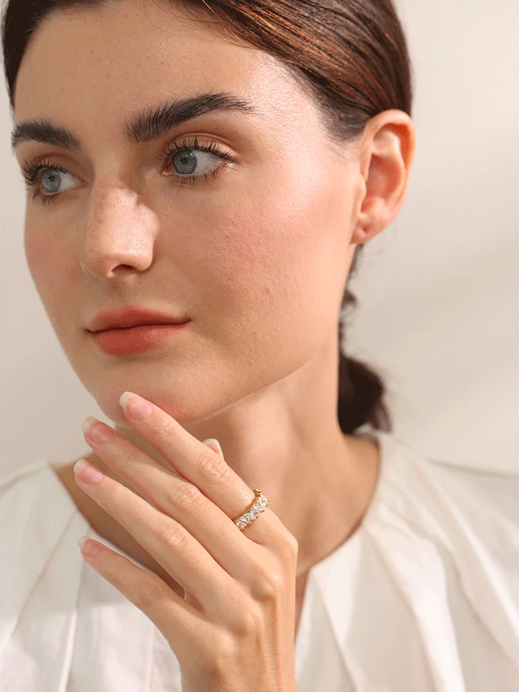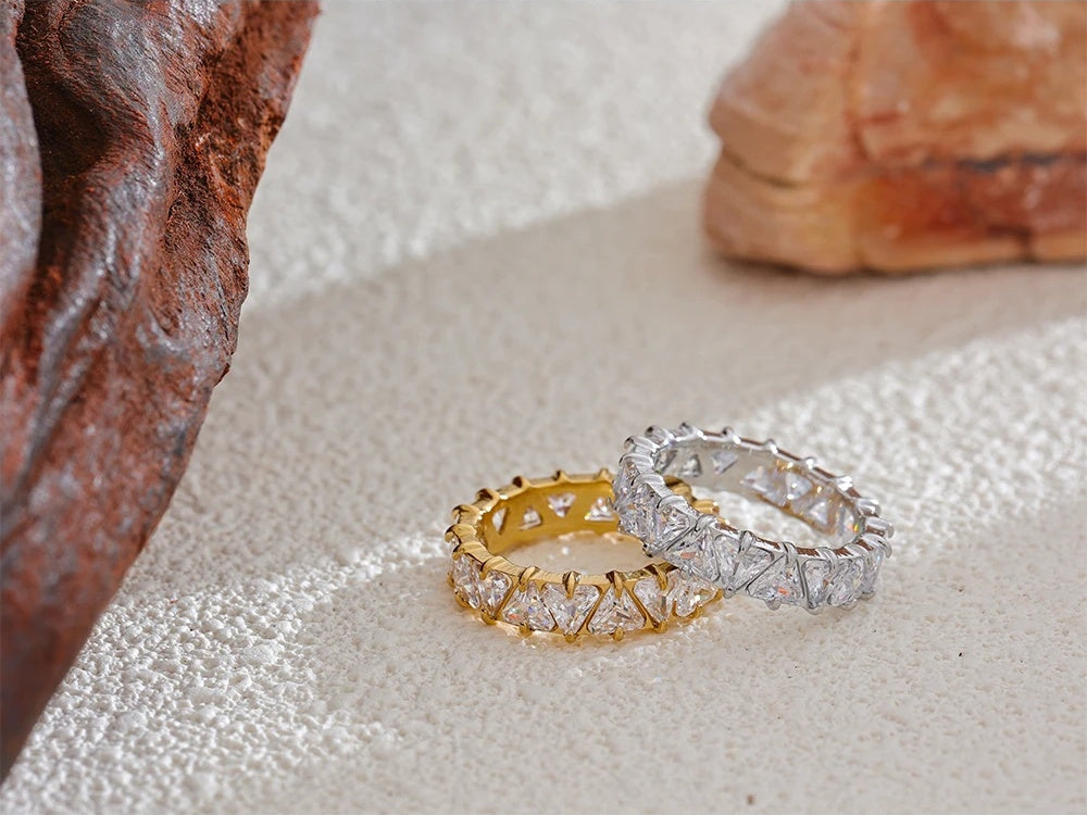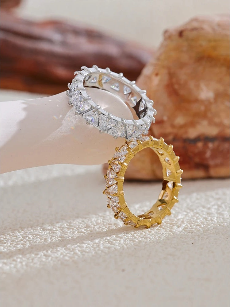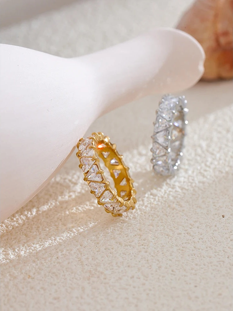 Crafted from durable stainless steel with a platinum or gold plating finish, this ring features a stunning row of geometric heart-shaped cubic zirconia stones set with secure prong settings. The sleek, shiny design offers a fashionable, high-quality look suitable for parties and everyday wear. Available in multiple sizes, it combines contemporary style with lasting elegance.