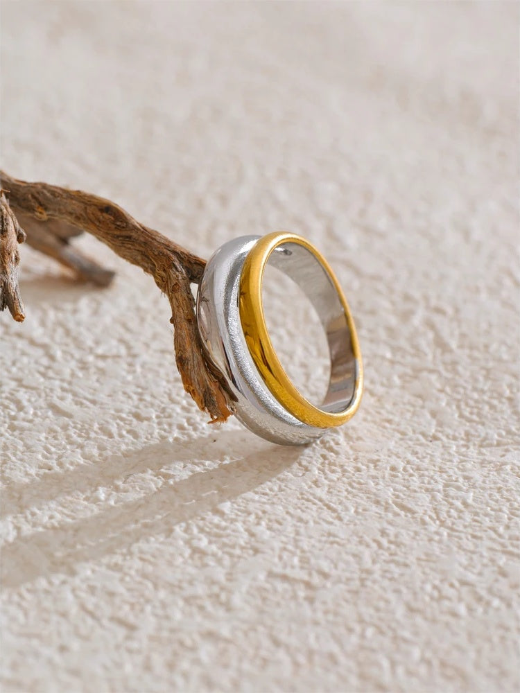A modern double-color ring featuring a sleek geometric design crafted from durable stainless steel with 18k gold plating. The combination of polished gold and silver tones creates a striking contrast, making it a versatile accessory for various occasions. Water-resistant and fashion-forward, this piece offers both style and resilience for everyday wear. Available in multiple sizes for a comfortable fit.