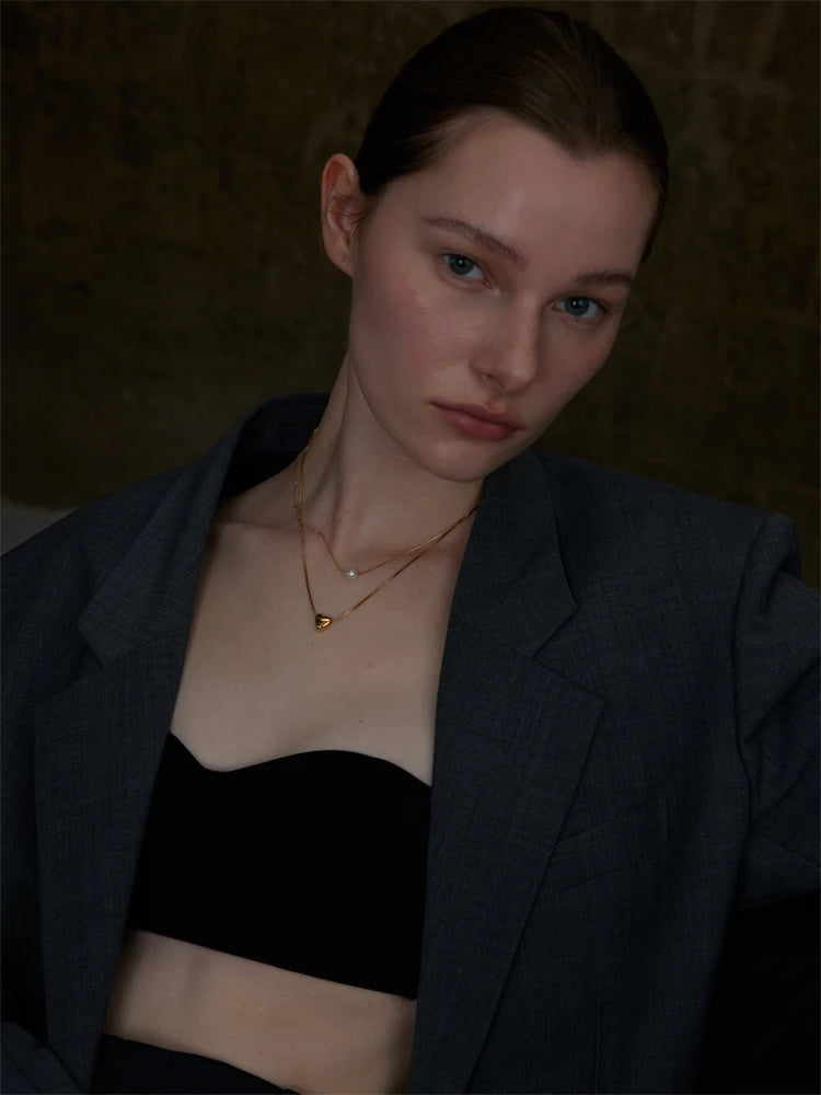 Double-layered chain necklace featuring a polished heart pendant and a simulated pearl accent. Crafted from stainless steel with a PVD real gold plating for durability and rust resistance. The geometric design balances modern style with timeless elegance, suitable for everyday wear or special occasions. Available in gold and platinum tones to complement various looks.