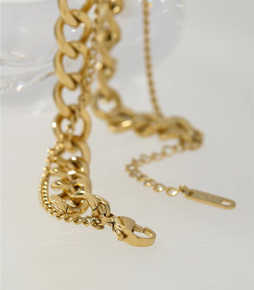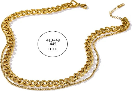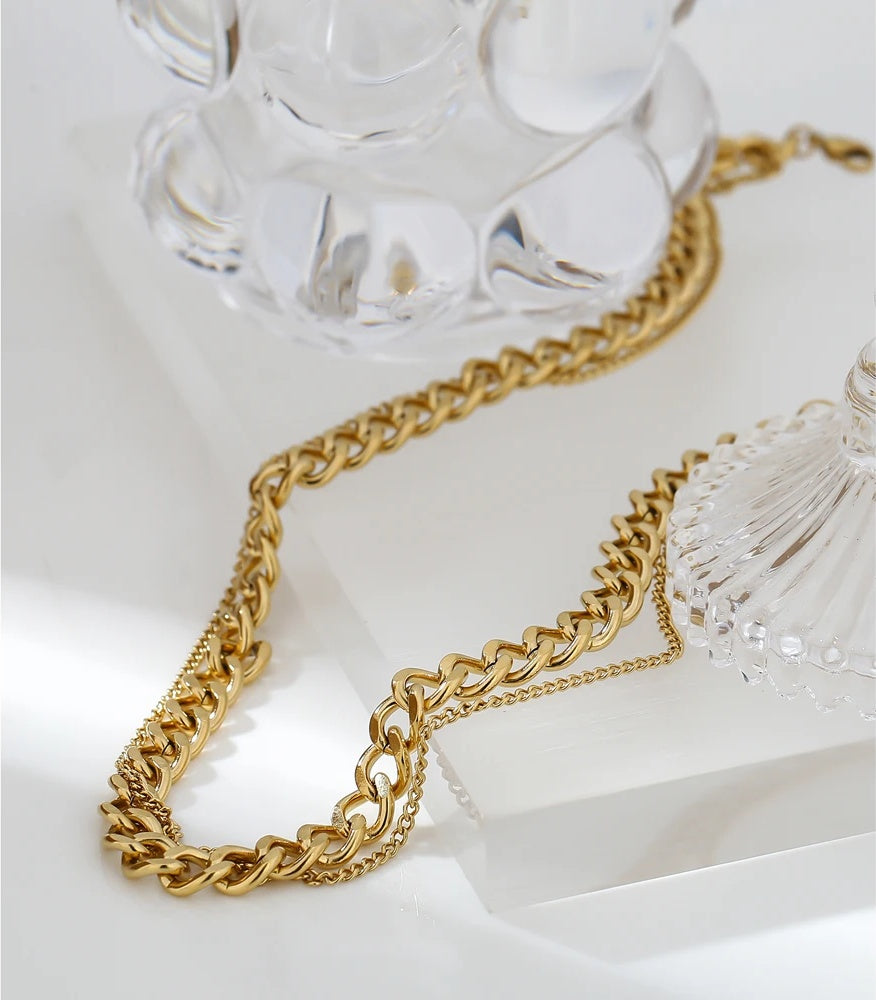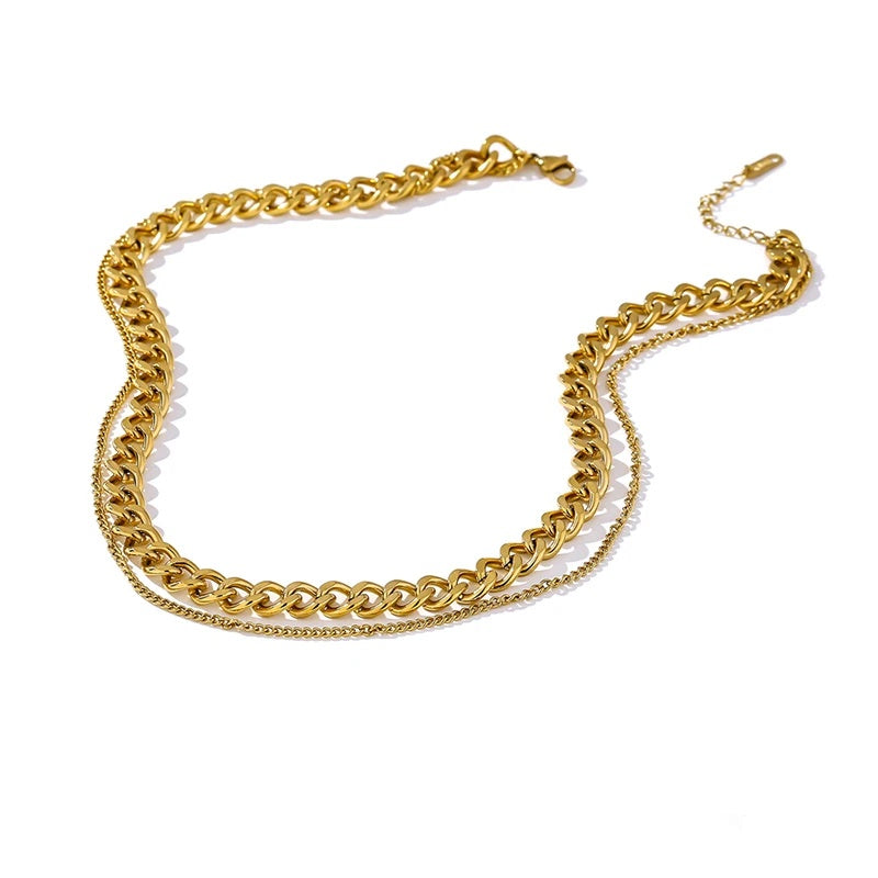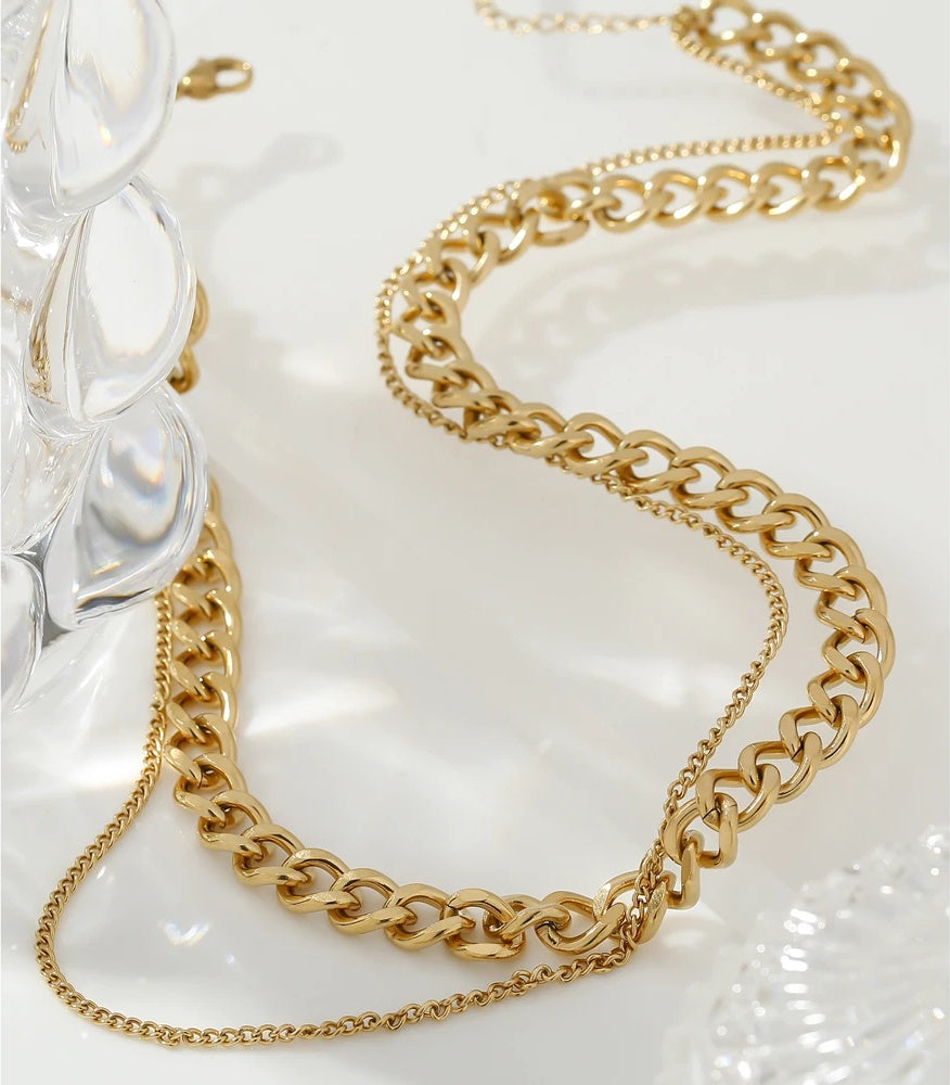 Elevate everyday style with a refined edge. This double-layer choker collar necklace pairs a bold geometric chain with a delicate link strand, creating a modern, balanced silhouette that transitions effortlessly from day to night. Crafted from durable 316 stainless steel and finished with PVD real gold plating, it offers a high-polish glow designed for long-lasting wear.