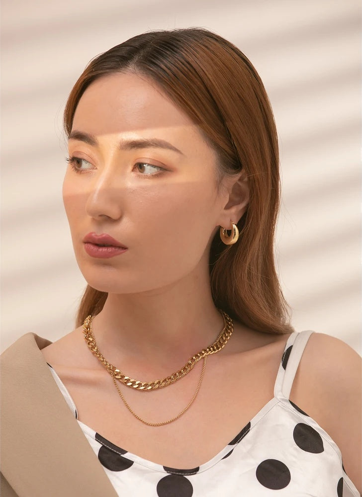 - Design: Layered collar-length choker featuring one chunky chain and one fine link chain for a sleek, dimensional look