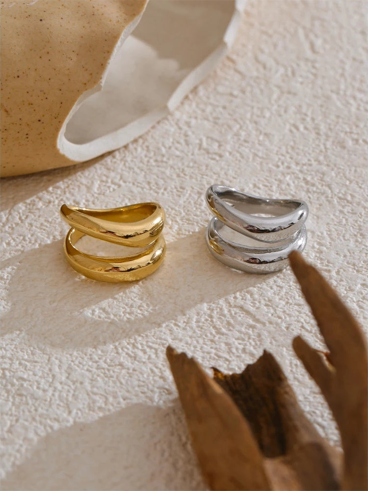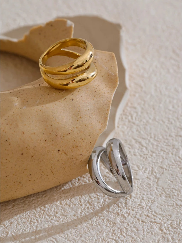 A contemporary double layer ring crafted from durable stainless steel offers a geometric design with a smooth, polished finish. The piece features a water-resistant texture that maintains its shine through daily wear. Available in gold or steel tones, it combines fashion-forward style with reliable material quality. Ideal for adding subtle yet distinctive detail to everyday or party attire. Multiple ring sizes ensure a comfortable and secure fit.
