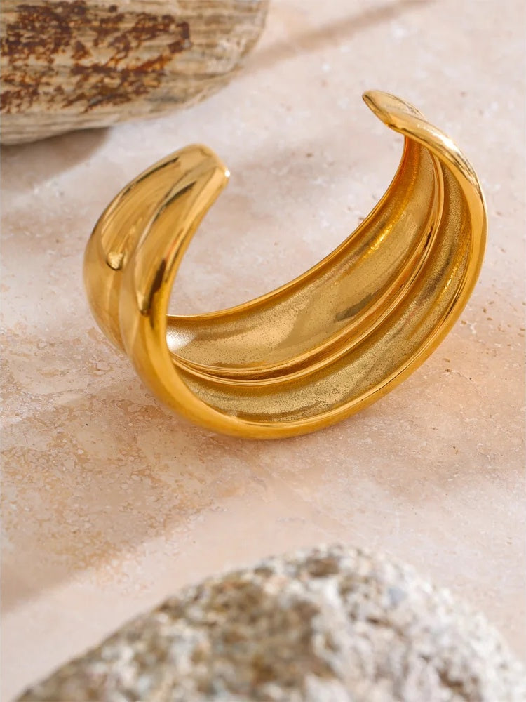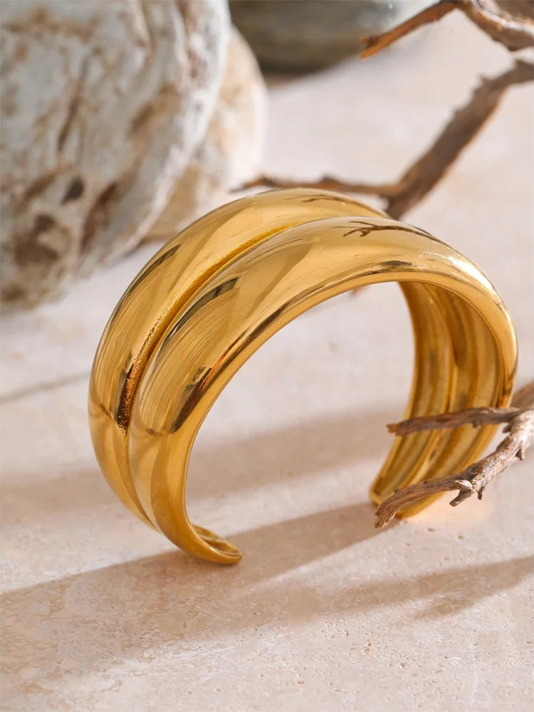 Crafted from stainless steel with an 18K golden PVD plating, this double-layer cuff bracelet features a smooth metal texture that adds a sleek, modern edge to any look. Its geometric design enhances visual interest while maintaining a bold statement piece appeal. Designed to be compatible with all styles, it offers durable fashion with a trendy flair. The open cuff style ensures easy wear and a comfortable fit for everyday use.