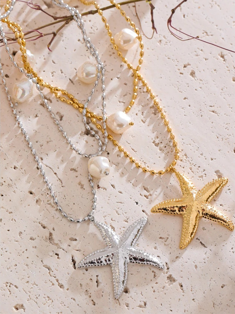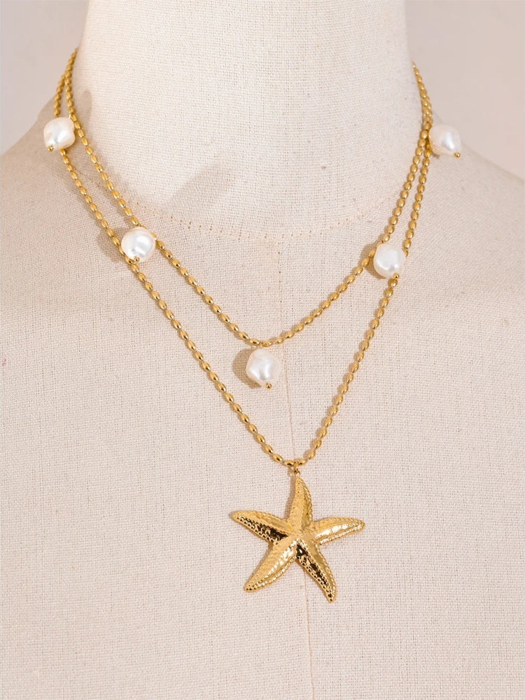 Crafted from stainless steel with a PVD real gold plating, this double-layer necklace features a textured starfish pendant paired with simulated pearls for a chic ocean-inspired look. Designed to be waterproof and durable, it is suitable for everyday wear during summer or holiday outings. The beaded chain adds a trendy touch, making it a versatile accessory for various styles.