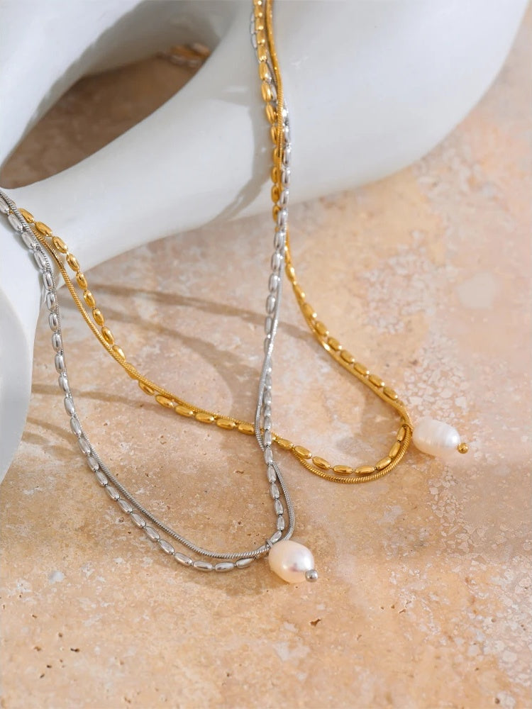 Elevate your everyday with a modern layered necklace that blends clean lines and soft luster. This double-layered design pairs a sleek stainless steel chain with a strand of polished metal beads for a refined, geometric look. A natural freshwater pearl pendant brings subtle elegance, creating a minimalist necklace that moves effortlessly from work to weekend.