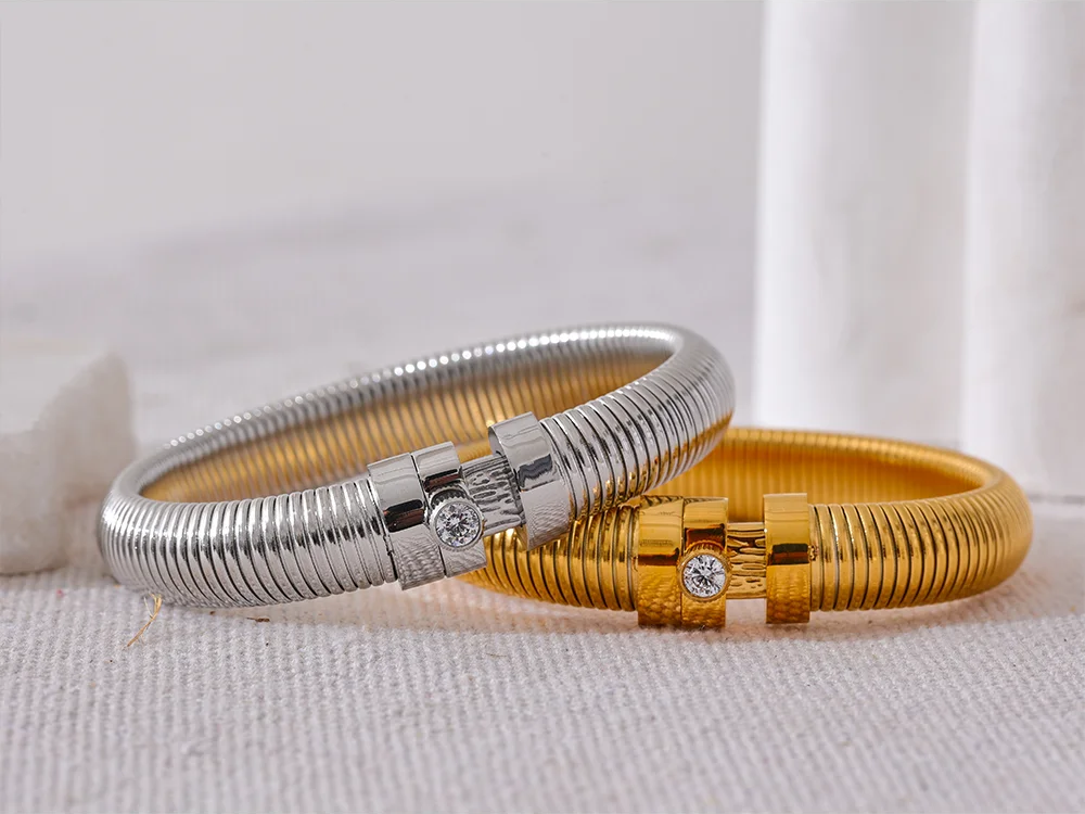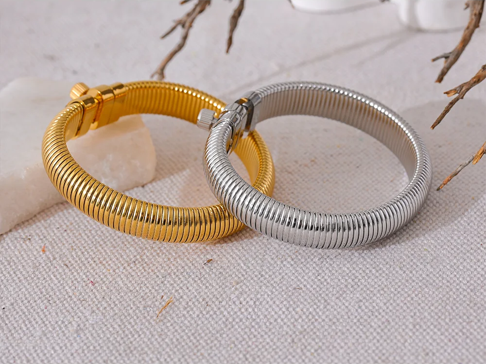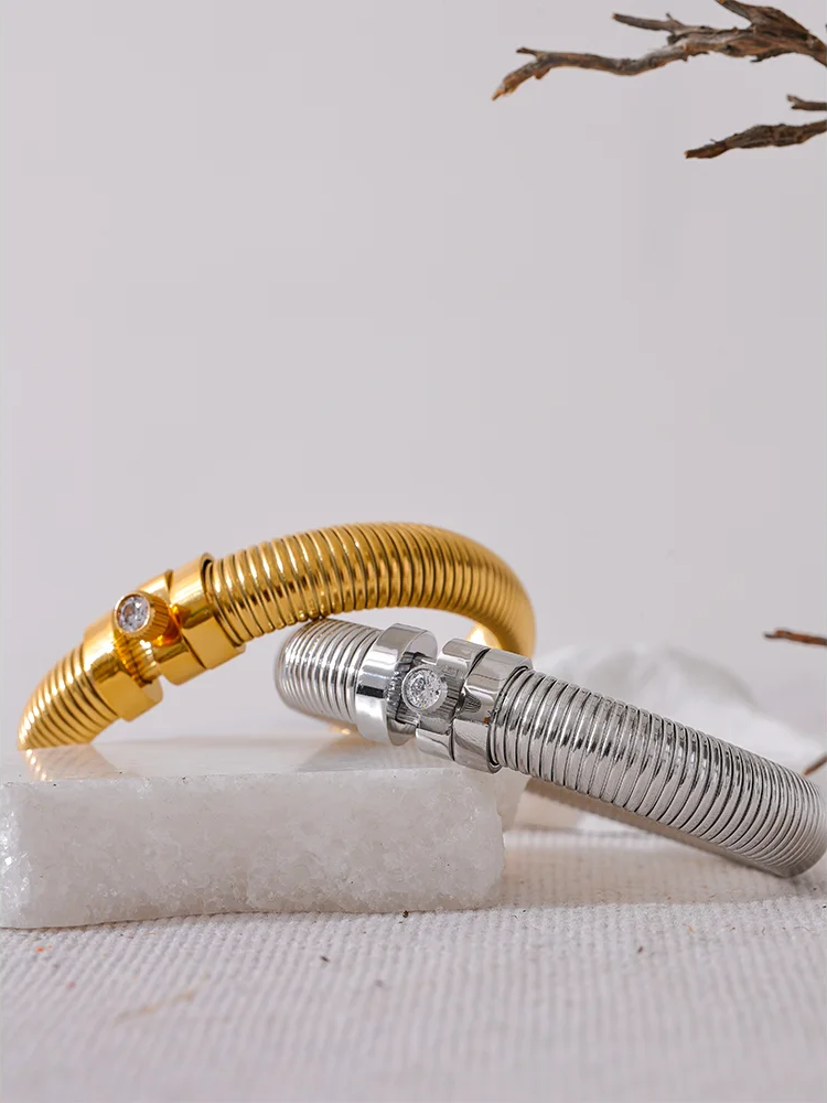 Crafted from durable stainless steel with a gold-color PVD plating, this thick bracelet features a flexible, elastic design for easy wear and a secure fit. The geometric tension mount setting showcases a sparkling cubic zirconia stone, adding a refined touch to the bold metal band. Waterproof and suitable for all occasions, this statement accessory complements both men’s and women’s fashion with a modern edge.