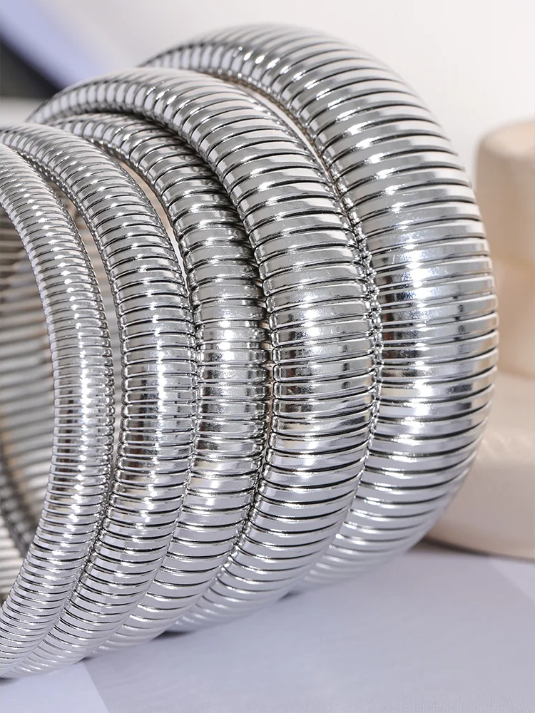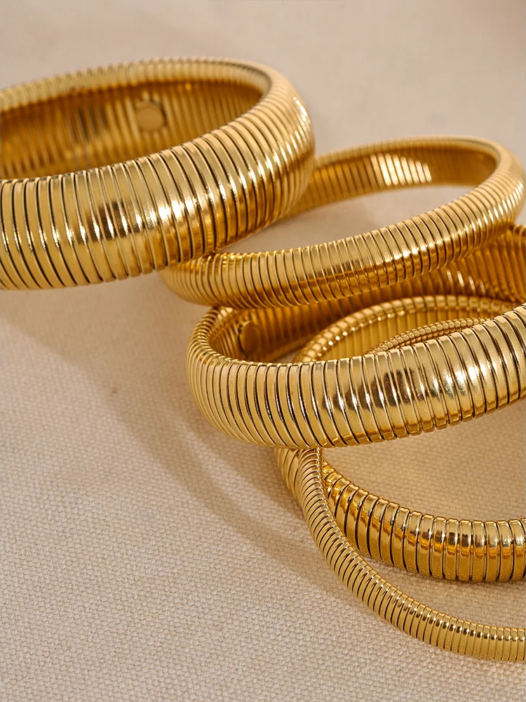 Crafted from durable stainless steel with a thick, elastic design, these bangles offer both strength and comfort. Featuring a high-quality PVD gold plating, they boast a sleek geometric pattern suitable for any outfit. Water-resistant and unisex, the bracelets come in multiple widths and colors, making them versatile accessories for daily wear. Their flexible construction ensures a secure fit without compromising style.