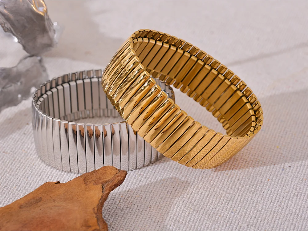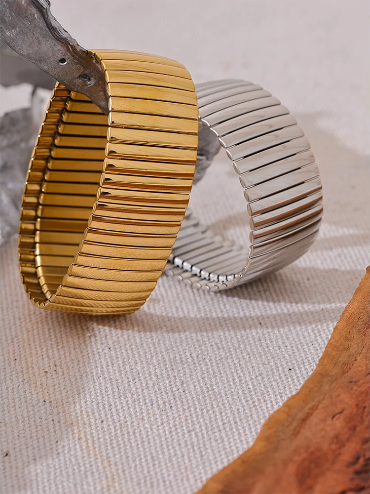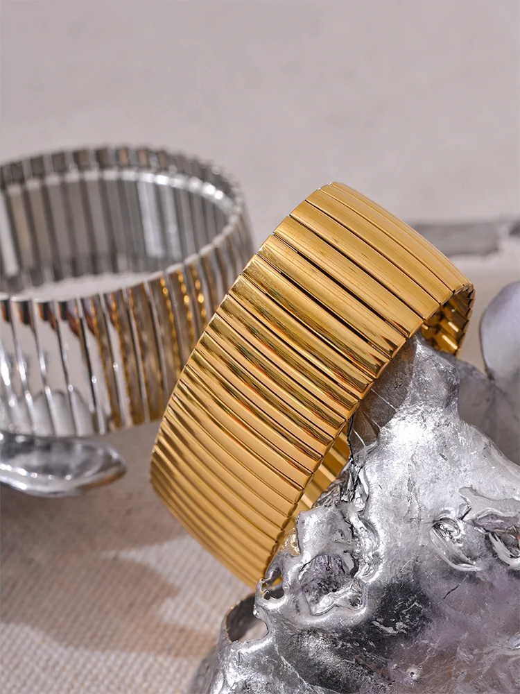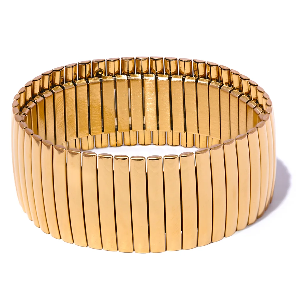 Crafted from durable 316L stainless steel with an 18K gold plating, this wide bangle bracelet combines strength and style. Its geometric, hyperbole design offers a bold statement while maintaining a sleek, polished finish. The elastic construction ensures a comfortable, adjustable fit suitable for all wrists. Resistant to rust and tarnish, this unisex accessory is both fashionable and long-lasting.