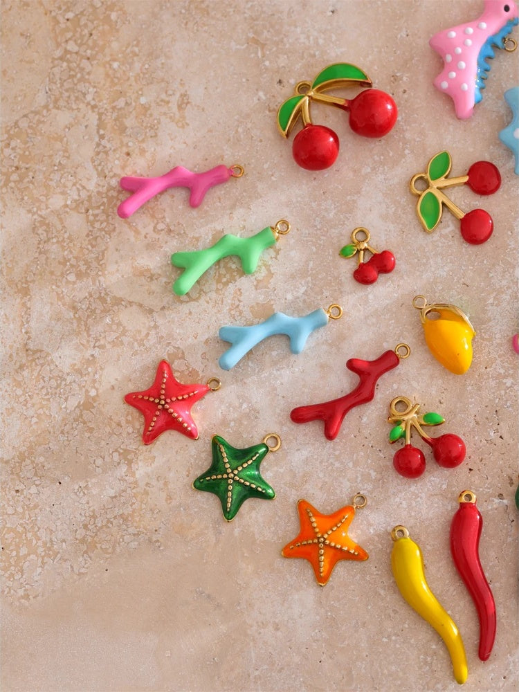 A vibrant collection of enamel charms featuring playful designs like cherries, fish, shells, hearts, starfish, and chili peppers. Crafted from durable stainless steel with a real gold plated finish, each charm offers a trendy, polished look. Perfect for DIY jewelry projects, these lightweight charms easily attach to necklaces, bracelets, or other accessories. Available in a variety of colorful options to suit diverse styles and preferences.