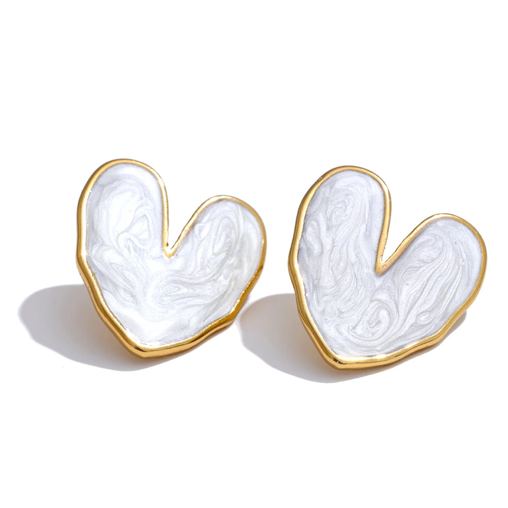 Bring a refined splash of color to your everyday style with these heart-shaped enamel stud earrings. Each pair showcases a marbled enamel finish in your choice of pink, blue, yellow, red, white, or black—subtle swirls that make every set beautifully unique. Crafted on a stainless steel base and finished with 18k gold plating plus PVD real gold electroplating, these gold-plated earrings are designed for waterproof, durable wear you can count on day after day.