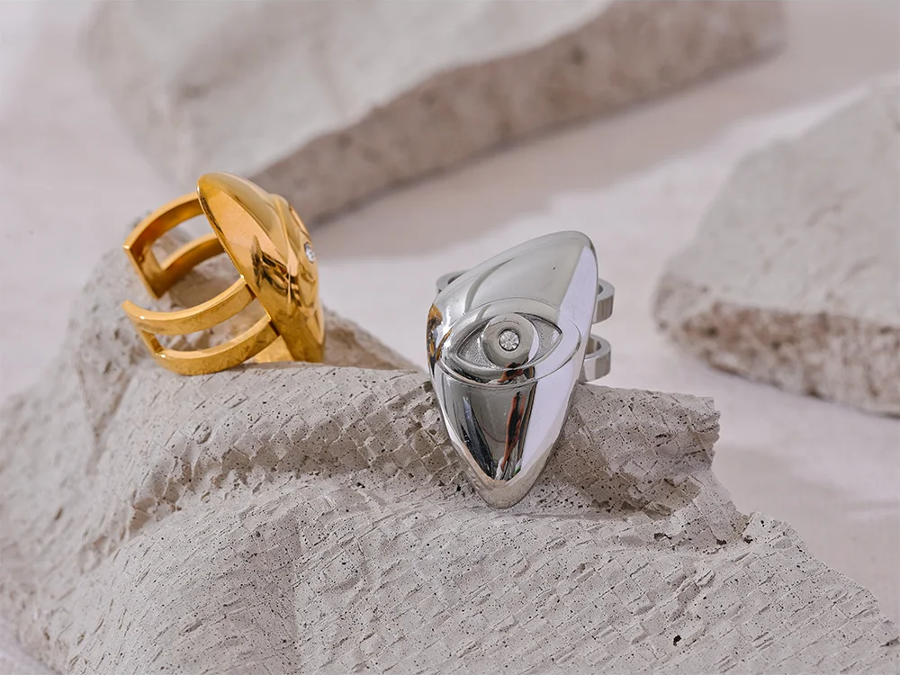 Crafted from durable stainless steel with 18k gold plating, this open ring features a unique eye triangle design accented with a sparkling cubic zirconia stone. Its geometric shape and tension mount setting create a striking statement suitable for parties and special occasions. The waterproof finish ensures lasting shine and wearability, while the adjustable open band offers a comfortable fit for everyday fashion.