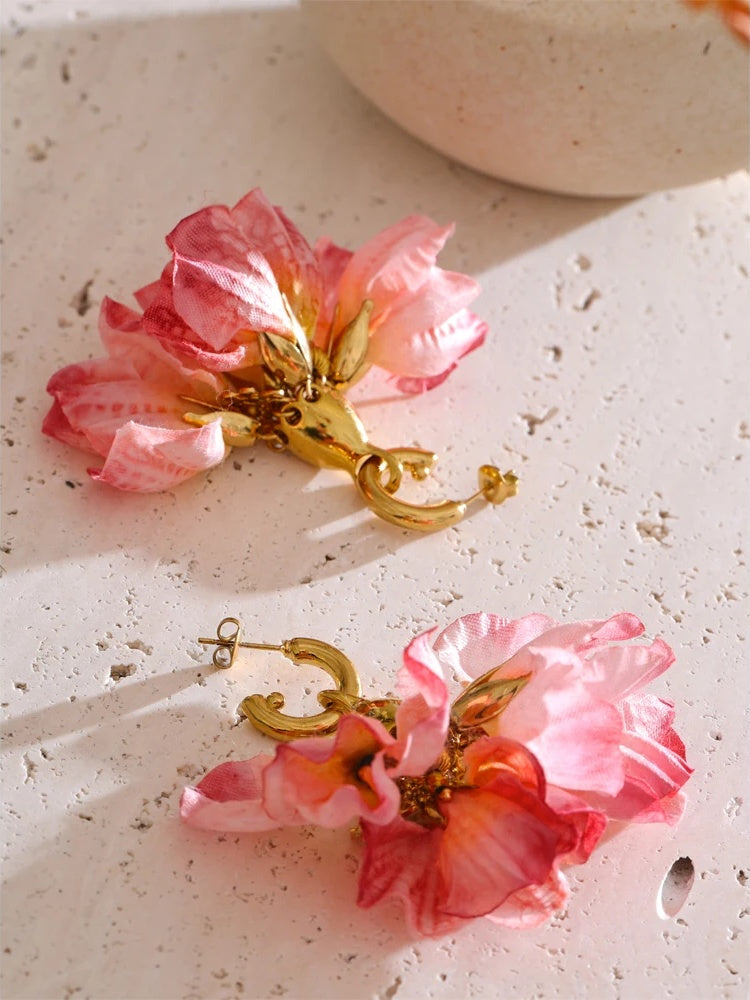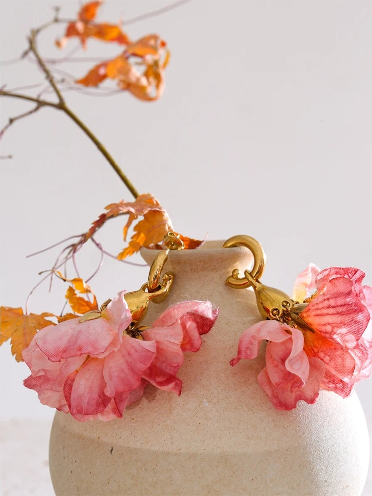 Delicate drop earrings featuring soft pink cloth flowers that create a romantic and feminine look. Crafted from stainless steel with a PVD real gold plating, these earrings combine durability with elegant design. The floral motif adds a whimsical touch, making them suitable for both casual and dressy occasions. Lightweight and comfortable, they offer a stylish accessory choice for women seeking a trendy plant-inspired style.