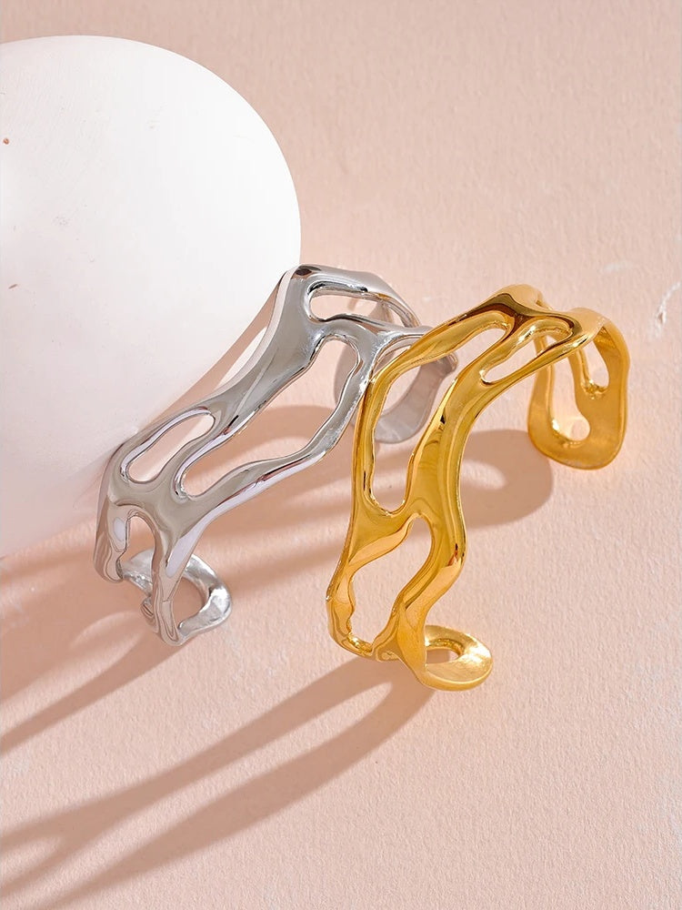 Crafted from durable stainless steel with a real gold PVD plating, this open cuff bracelet features an abstract geometric design that offers a modern, artistic touch. The lightweight metal ensures comfortable wear while maintaining a bold statement look. Resistant to water, it’s suitable for everyday use and versatile enough to complement a variety of styles.