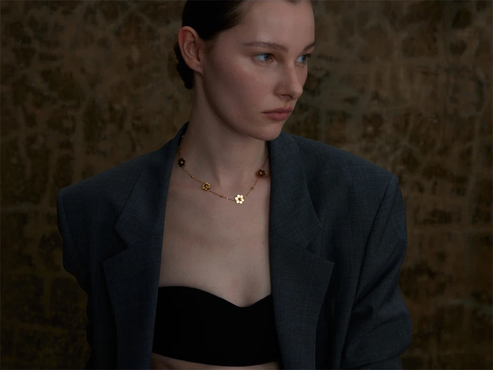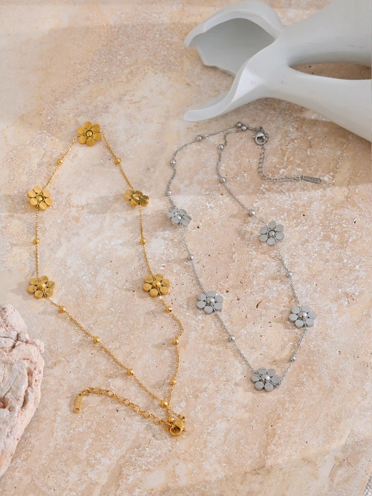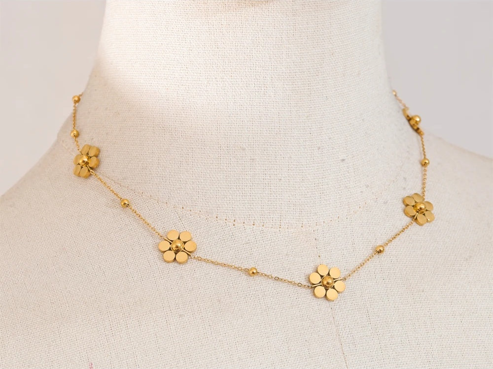 Crafted from durable stainless steel with a polished finish, this chain necklace features a series of finely detailed flower-shaped links. The high-quality PVD gold plating enhances its waterproof and tarnish-resistant properties, ensuring lasting shine and elegance. Designed with a trendy geometric pattern, it serves as a versatile accessory suitable for parties and everyday wear.