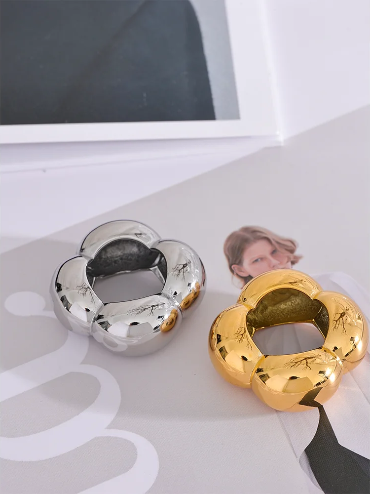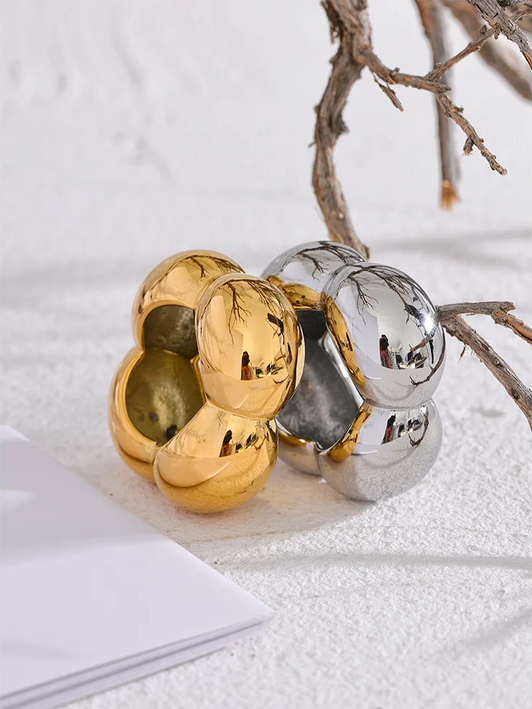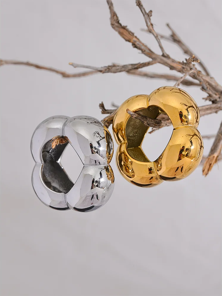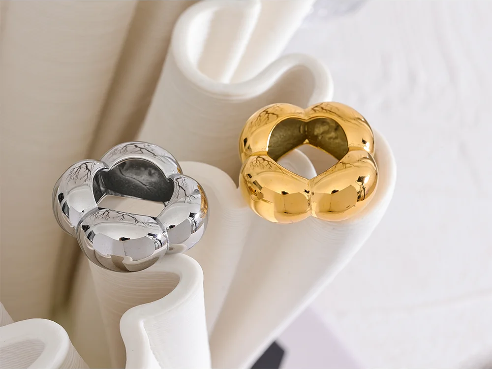 Crafted from durable stainless steel with an 18k gold plating, this ring showcases a bold floral hollow design that makes a striking statement. Its smooth, polished surface offers a waterproof texture, ensuring lasting shine and wear resistance. Suitable for all occasions, this trendy piece combines contemporary geometric style with comfortable wearability. Available in multiple sizes and finishes to complement diverse tastes.