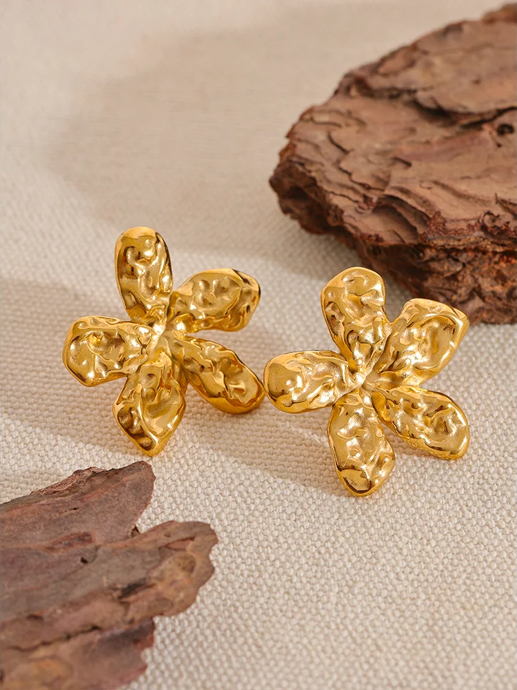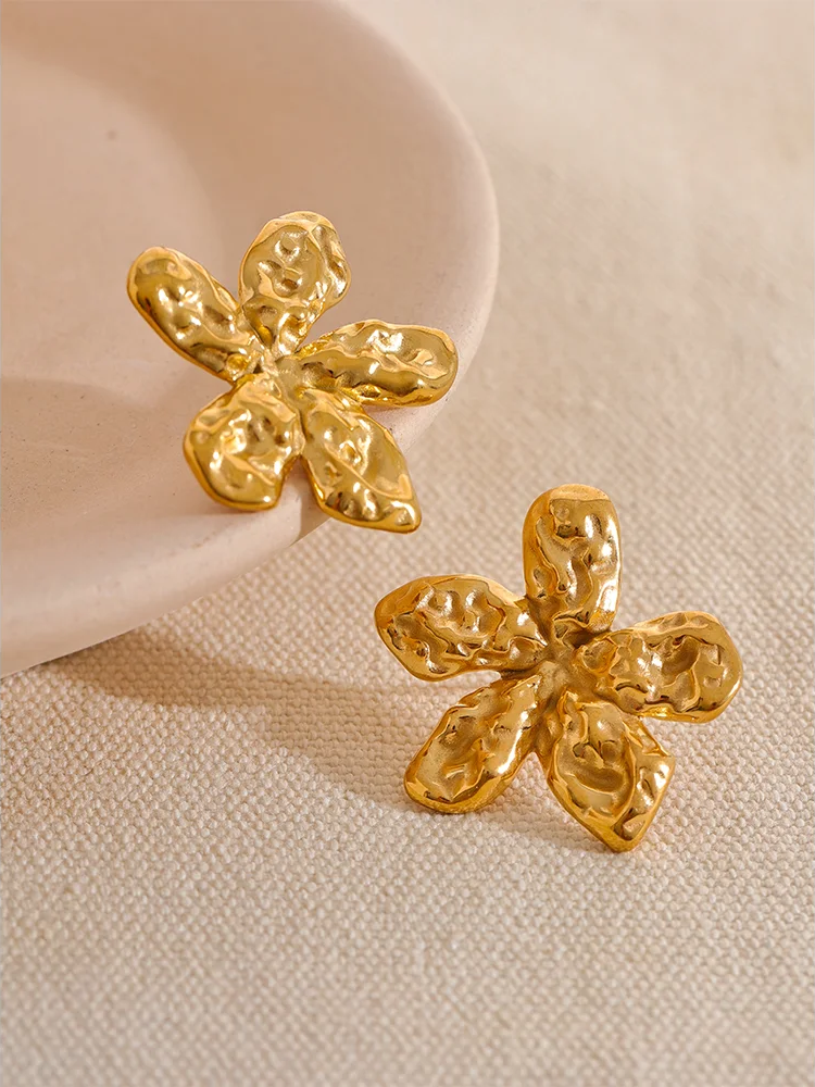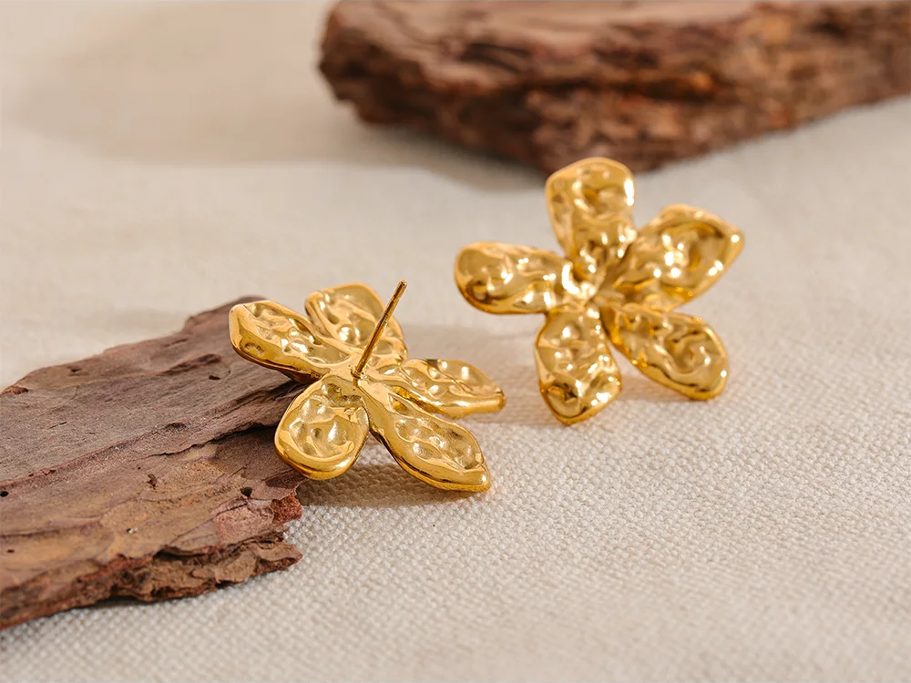 Elevate your everyday look with these floral stud earrings—crafted in durable stainless steel and finished in a rich gold-tone that catches the light beautifully. A textured, sculptural petal design brings subtle dimension and shine, while comfortable push-back posts keep them secure from morning to night.