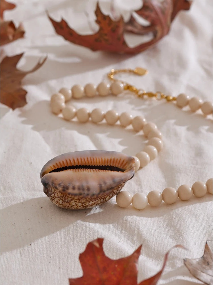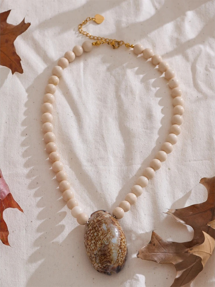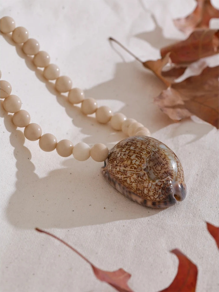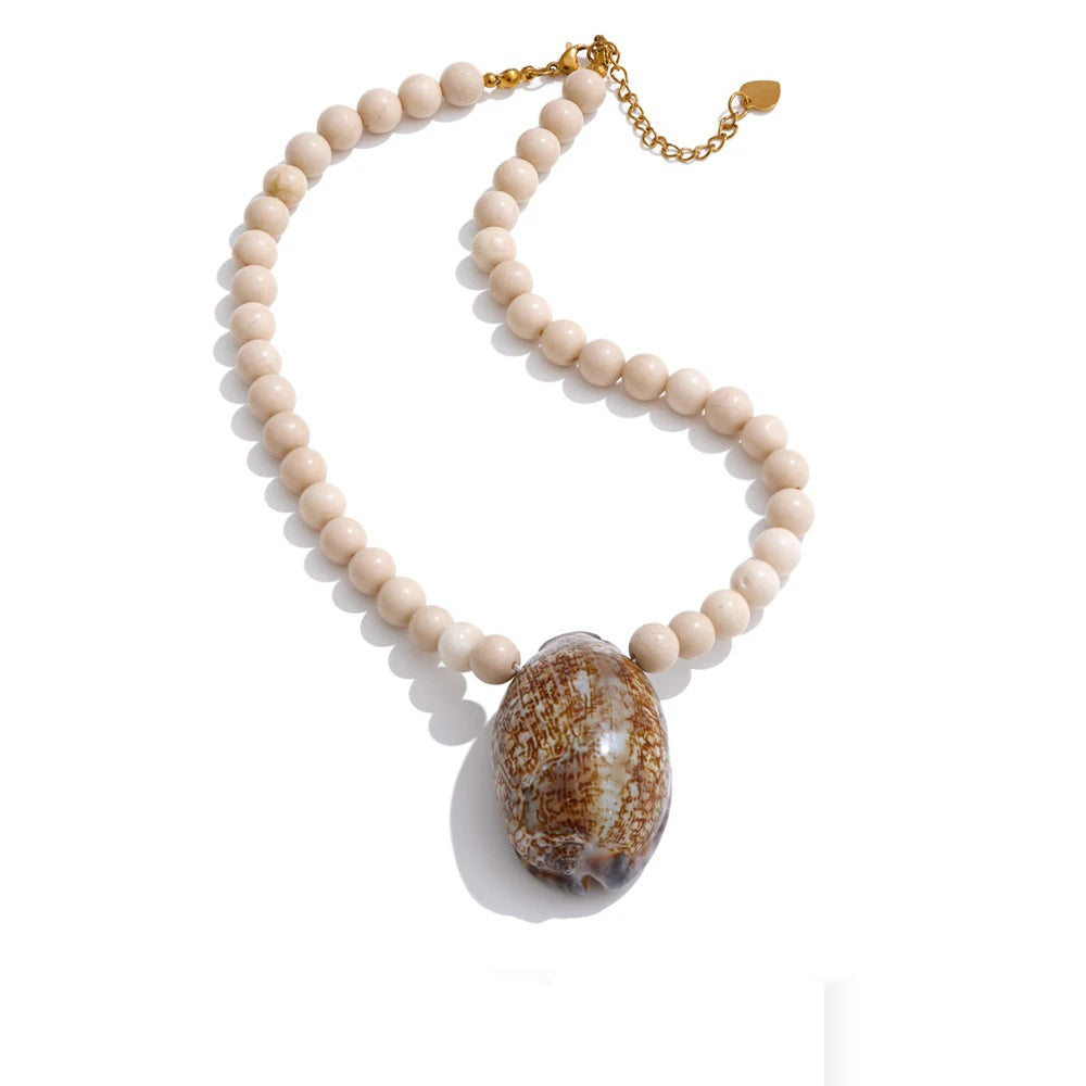 - Design: Large conch shell pendant accented by smooth fossil stone beads and subtle geometric detailing