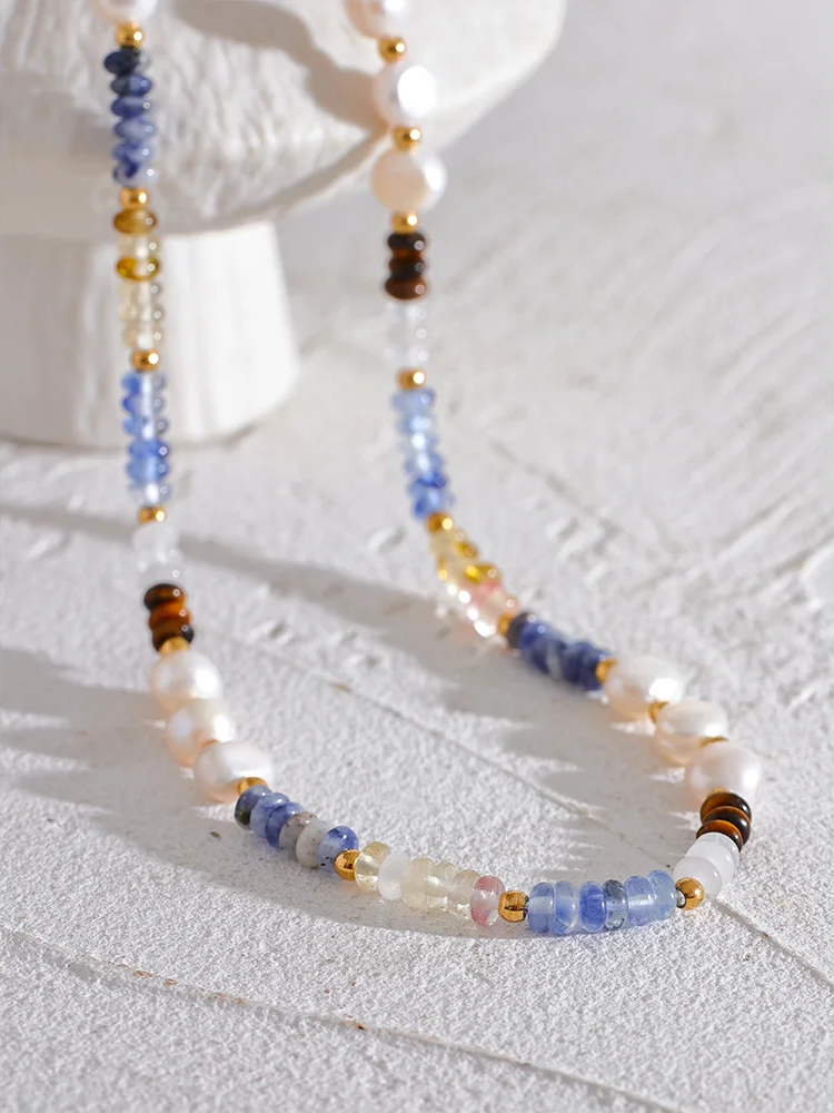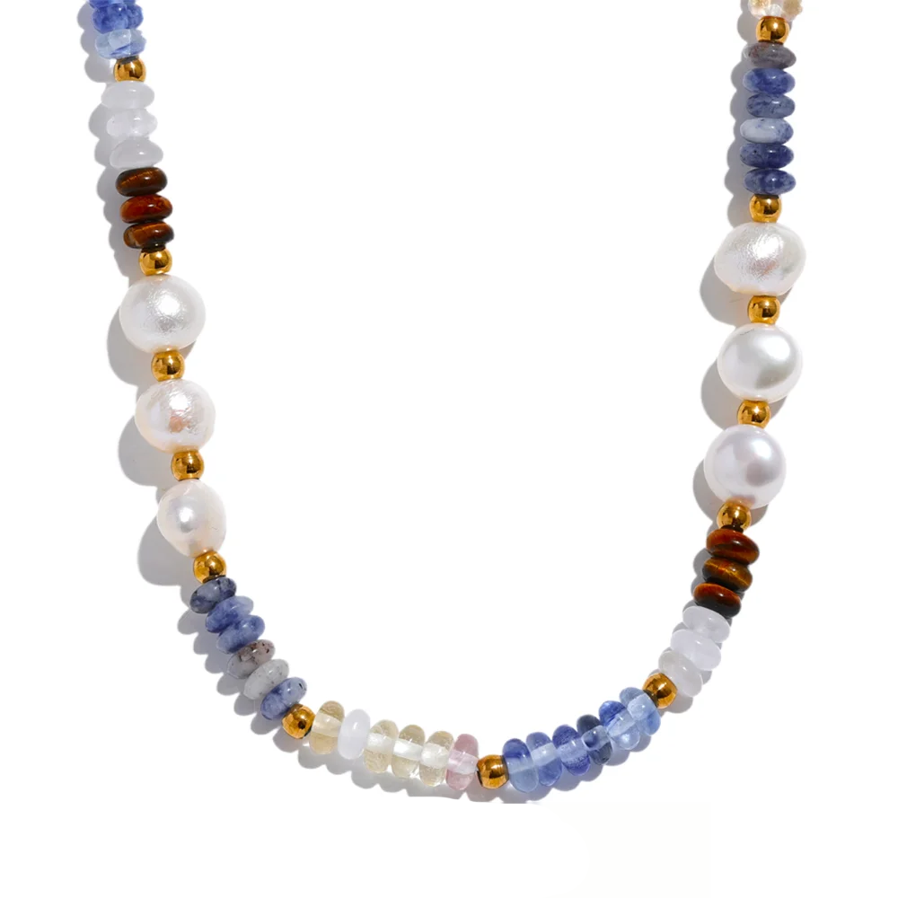 Handcrafted with precision, this necklace features a combination of natural freshwater pearls and vibrant lapis lazuli beads, accented by polished stainless steel elements with a gold-plated finish. The geometric arrangement of stones creates a distinctive and trendy look suitable for various occasions. Lightweight yet durable, it offers compatibility with all styles, making it a versatile accessory for everyday wear or special events.