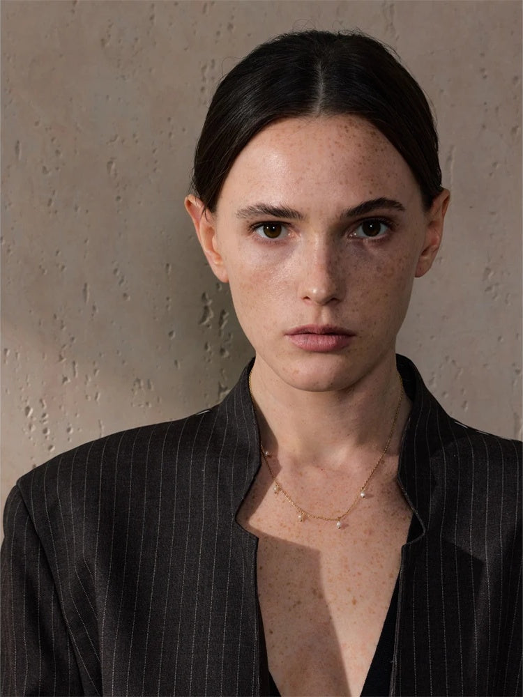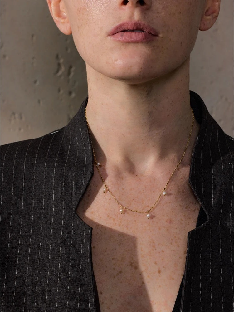 Timeless and modern at once, this freshwater pearl necklace features a slim, minimalist link chain crafted from durable stainless steel and finished with a luminous 18K PVD gold plating. Natural pearls are spaced evenly along the chain to create a clean, balanced silhouette that complements everything from everyday tees to evening dresses.