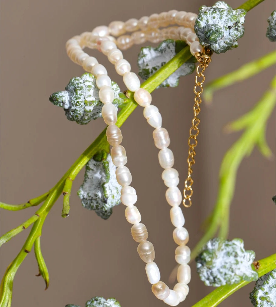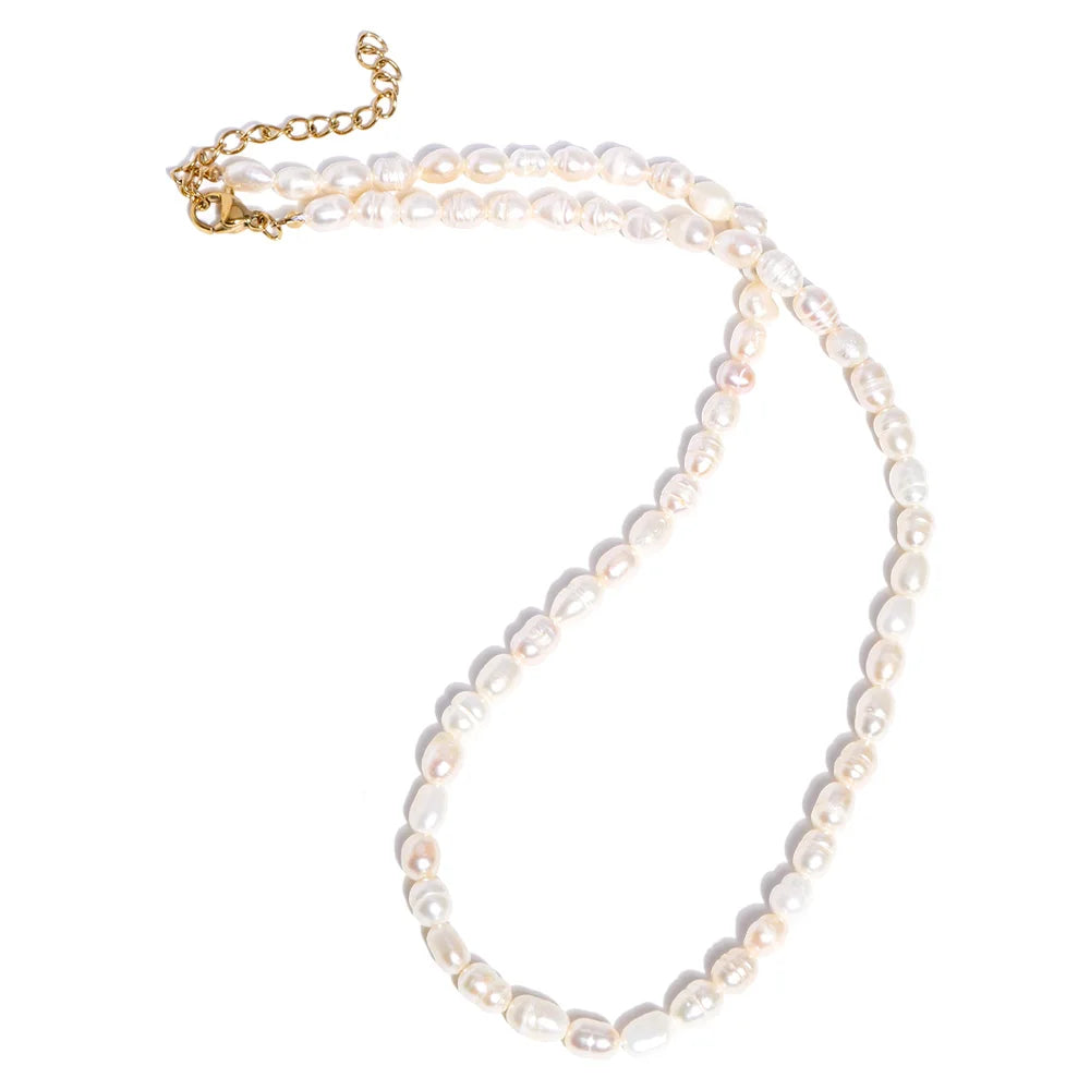 Handcrafted from natural freshwater pearls, this jewelry set includes a necklace and bracelet designed to complement any outfit. Each piece features lustrous pearls with a unique geometric shape, strung together on a stainless steel chain with gold-color plating for added durability. Adjustable clasps ensure a comfortable fit, making it suitable for various occasions like parties or casual wear. The set offers a timeless and elegant addition to any jewelry collection.