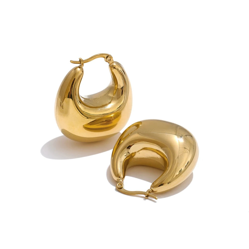 Chunky hoop earrings crafted from high-quality stainless steel with a glossy, smooth finish. The hollow design makes them lightweight while maintaining a bold and modern geometric silhouette. Electroplated with a durable PVD layer for long-lasting shine and resistance to tarnishing. Available in both gold and steel tones to complement various styles.