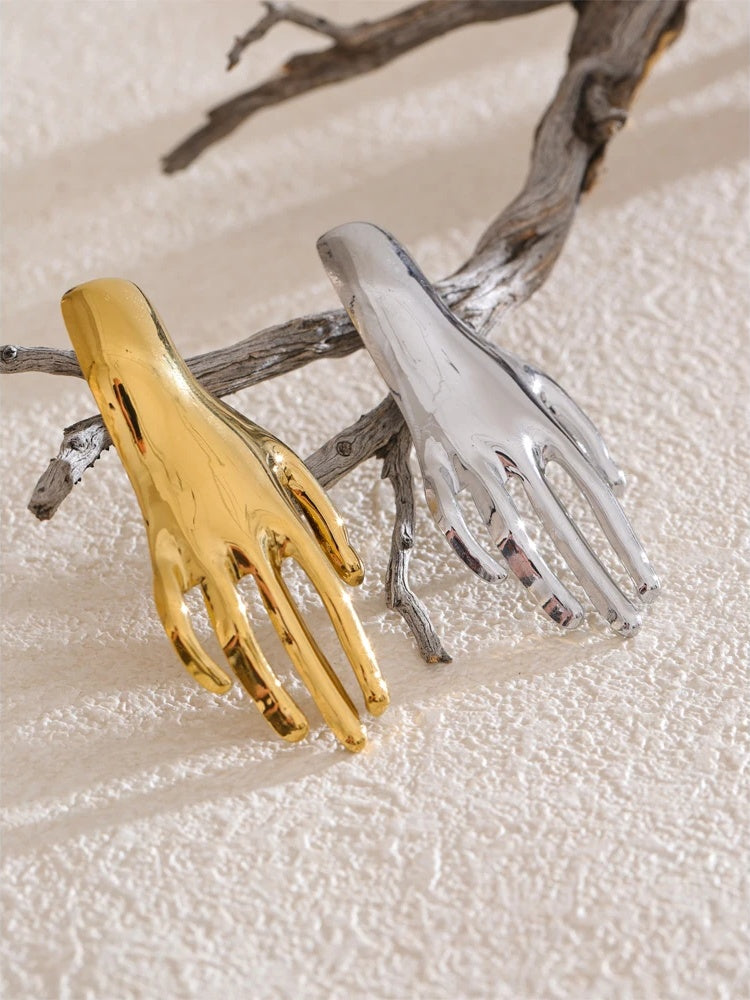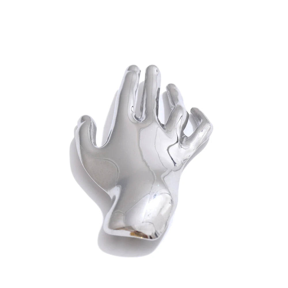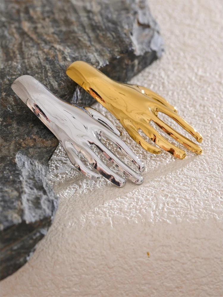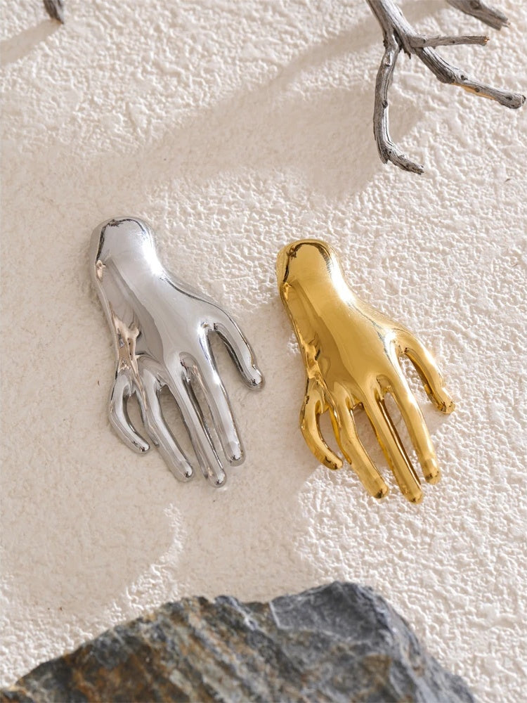 Featuring a glossy finish and a unique hand palm design, this metal brooch pin offers a modern geometric style ideal for fashion-forward accessories. Crafted from durable stainless steel with an electroplated PVD coating, it is available in striking gold and silver tones. Lightweight yet sturdy, it adds a distinctive accent to any outfit, perfect for birthdays or special occasions.