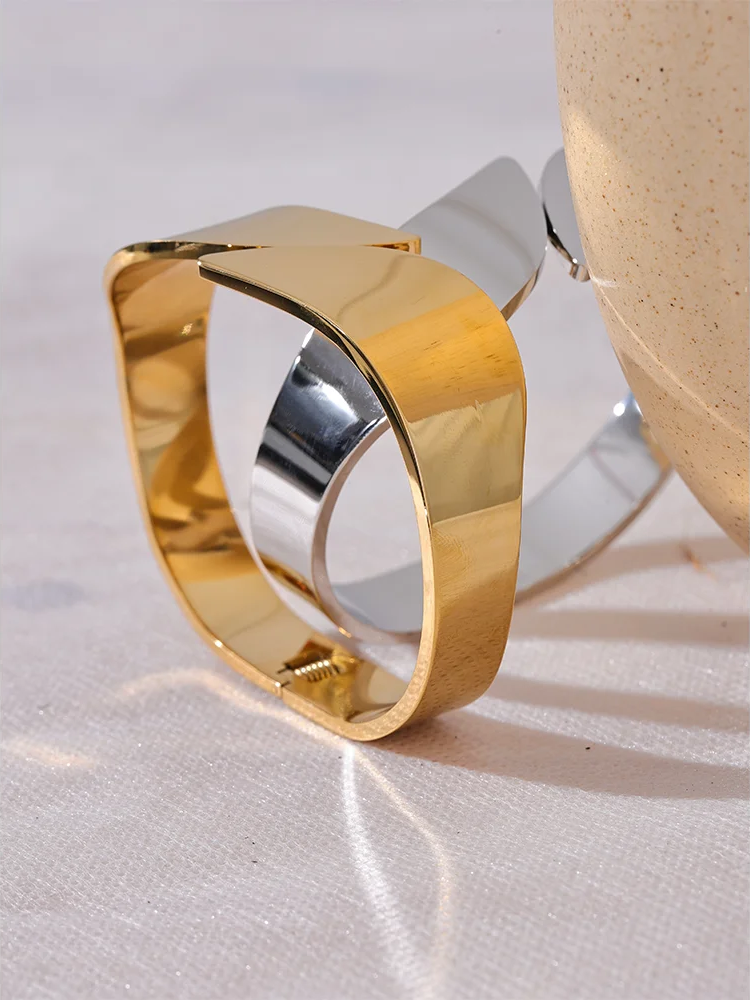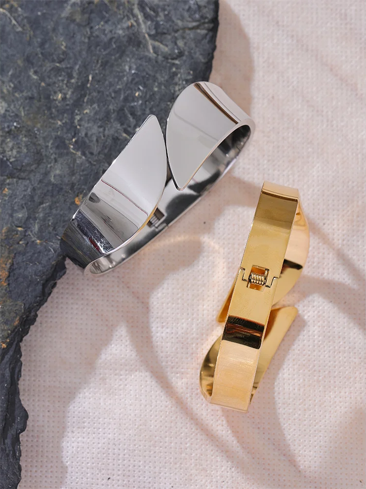 Crafted from durable stainless steel, this wide bangle bracelet features a glossy, smooth finish with a contemporary geometric design. The 18K gold PVD plating adds a rich golden hue while ensuring long-lasting wear and waterproof protection. Its sleek, modern shape makes it a versatile accessory suitable for various styles and occasions. The secure clasp provides comfortable, all-day wear without compromising on elegance.