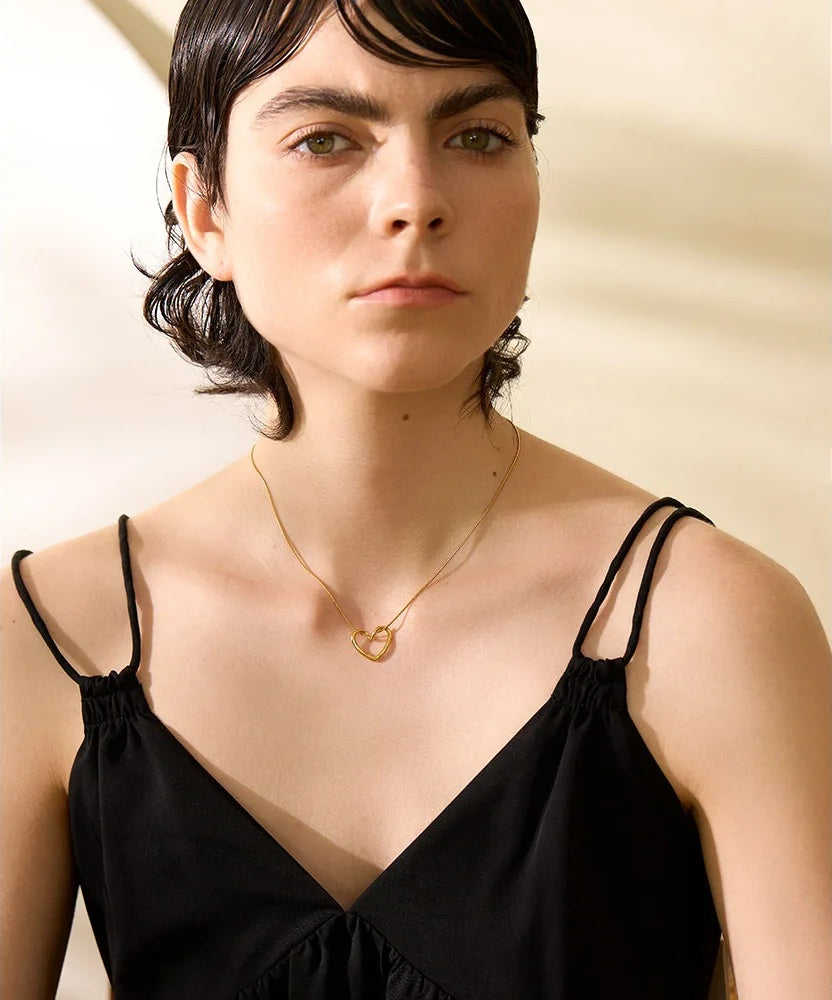 A minimalist heart-shaped pendant crafted from durable stainless steel with a sleek golden finish, designed to resist rust and tarnish. The pendant hangs from a smooth link chain, offering a lightweight and comfortable fit for everyday wear. Its open geometric design adds a modern touch, making it suitable for a variety of occasions. This pendant necklace combines simplicity with contemporary style for a versatile accessory.