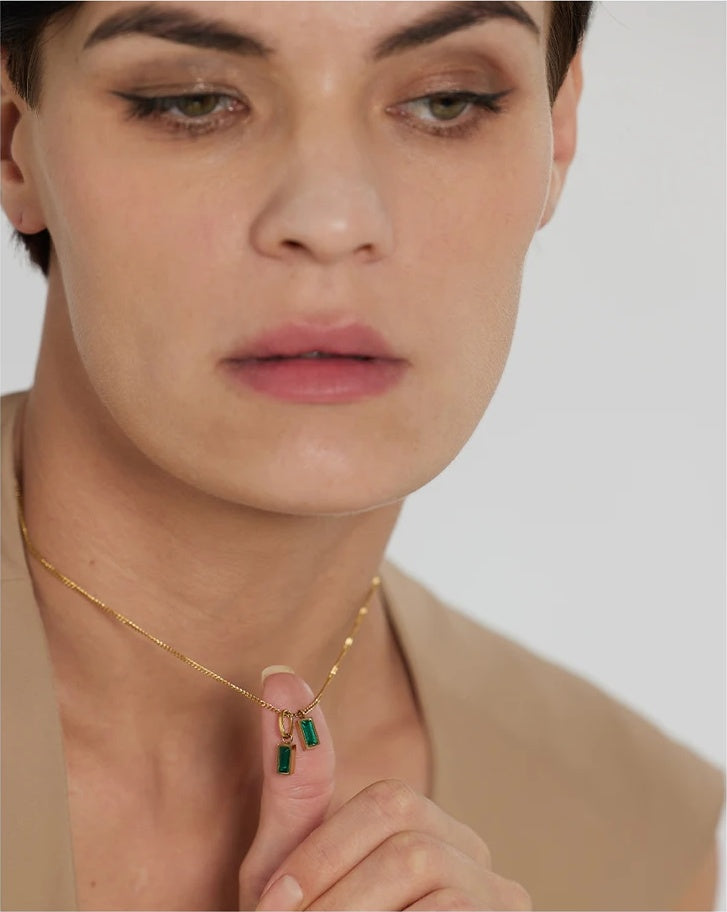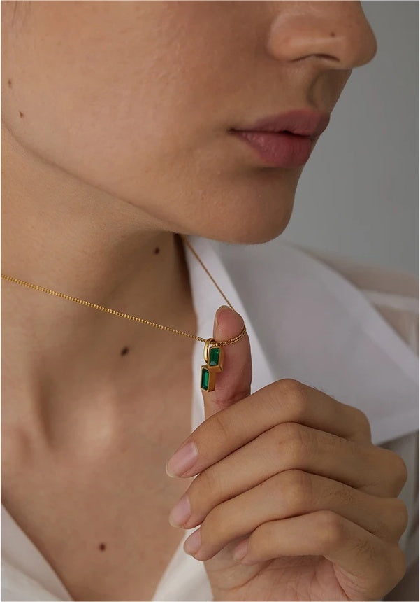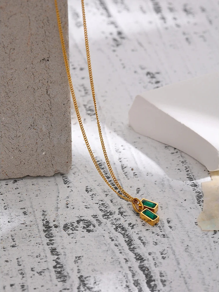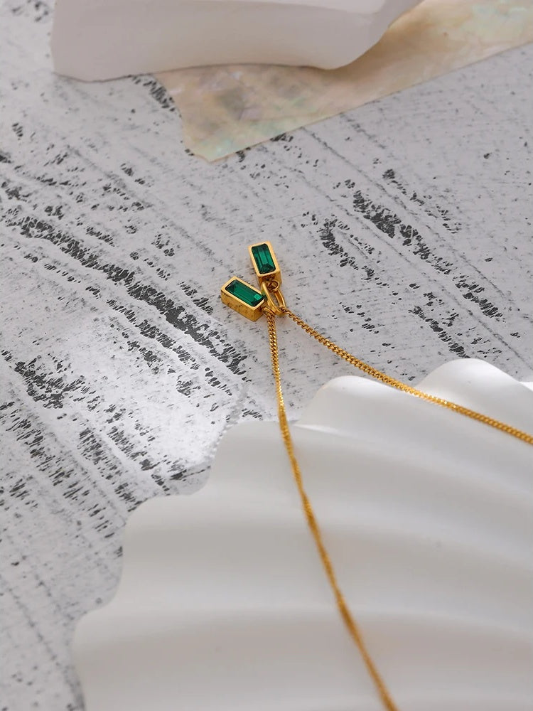 A stylish pendant necklace featuring geometric-shaped green cubic zirconia stones set in durable stainless steel with a gold-tone finish. The duo of rectangular stones offers a contemporary look that complements a variety of outfits. Lightweight and hypoallergenic, it is suitable for everyday wear or special occasions. Designed with a trendy aesthetic to enhance any jewelry collection.