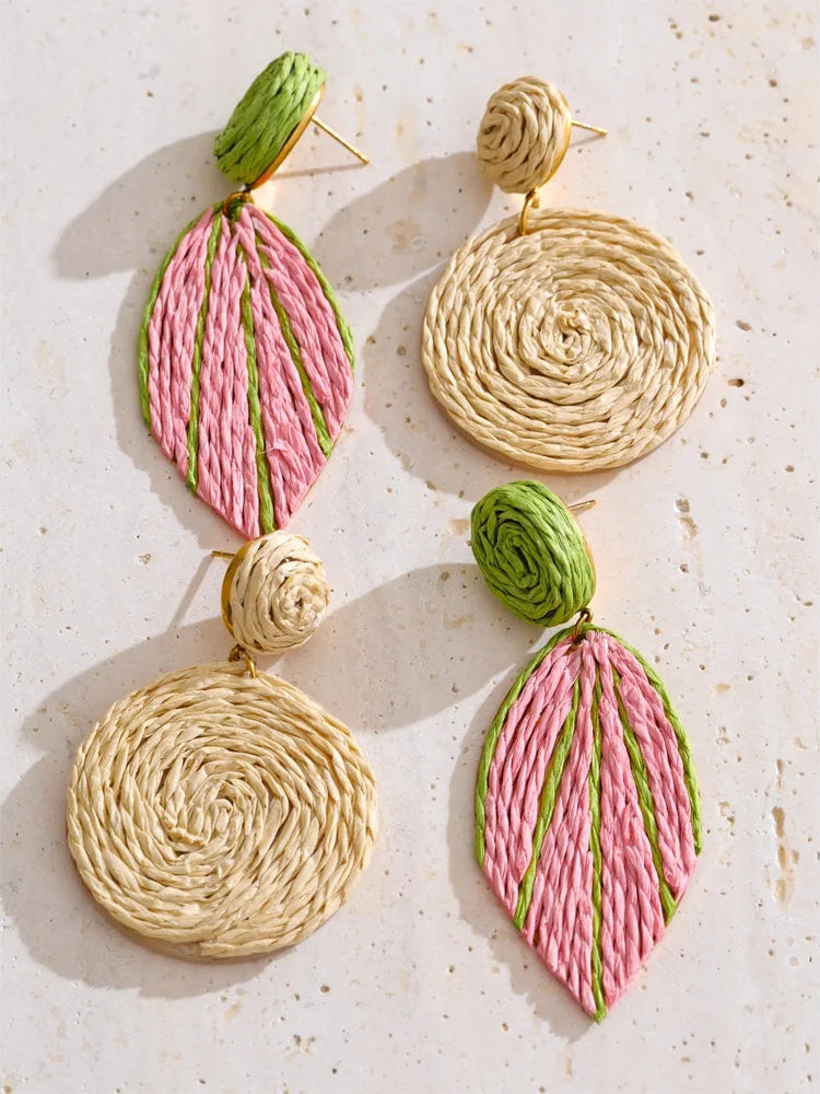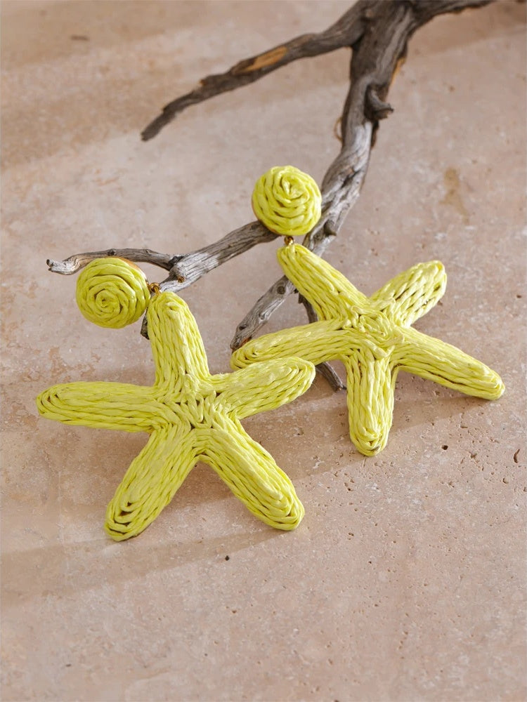 These dangle earrings feature a playful starfish design crafted from green raffia, perfect for a fresh and natural look. Made with stainless steel and finished with a gold-color plating, they offer durability along with a trendy ocean-inspired style. Lightweight and comfortable, they are ideal for summer fashion and casual wear.