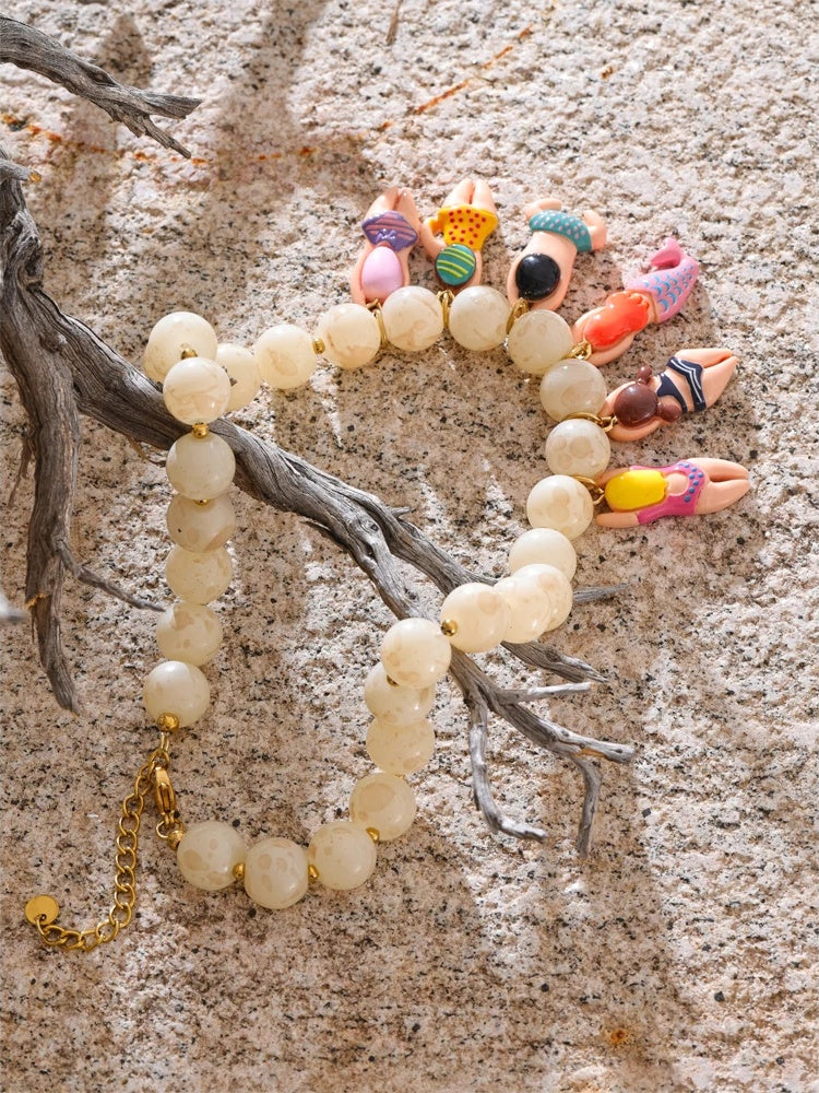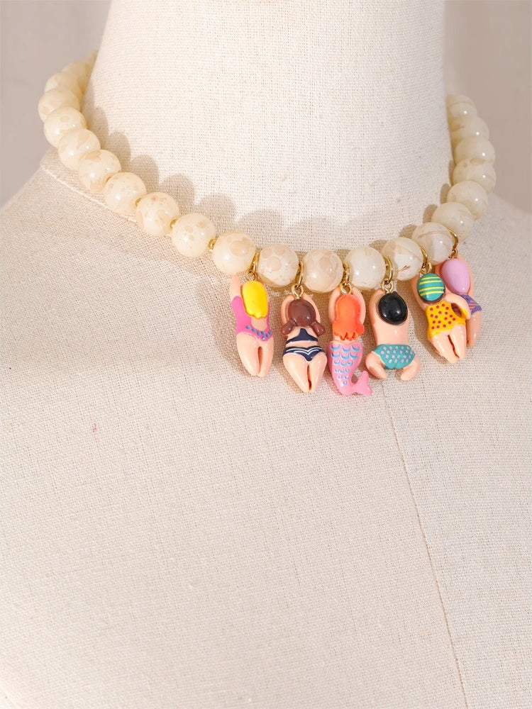 A playful necklace featuring creamy resin beads accented with colorful, handcrafted bikini doll charms that add a whimsical touch to any outfit. The chain is finished with PVD real gold plating on stainless steel, ensuring durability and a polished look. Lightweight and comfortable, it offers a unique geometric style that stands out in casual or trendy fashion ensembles. Adjustable length provides a customizable fit for versatile wear.