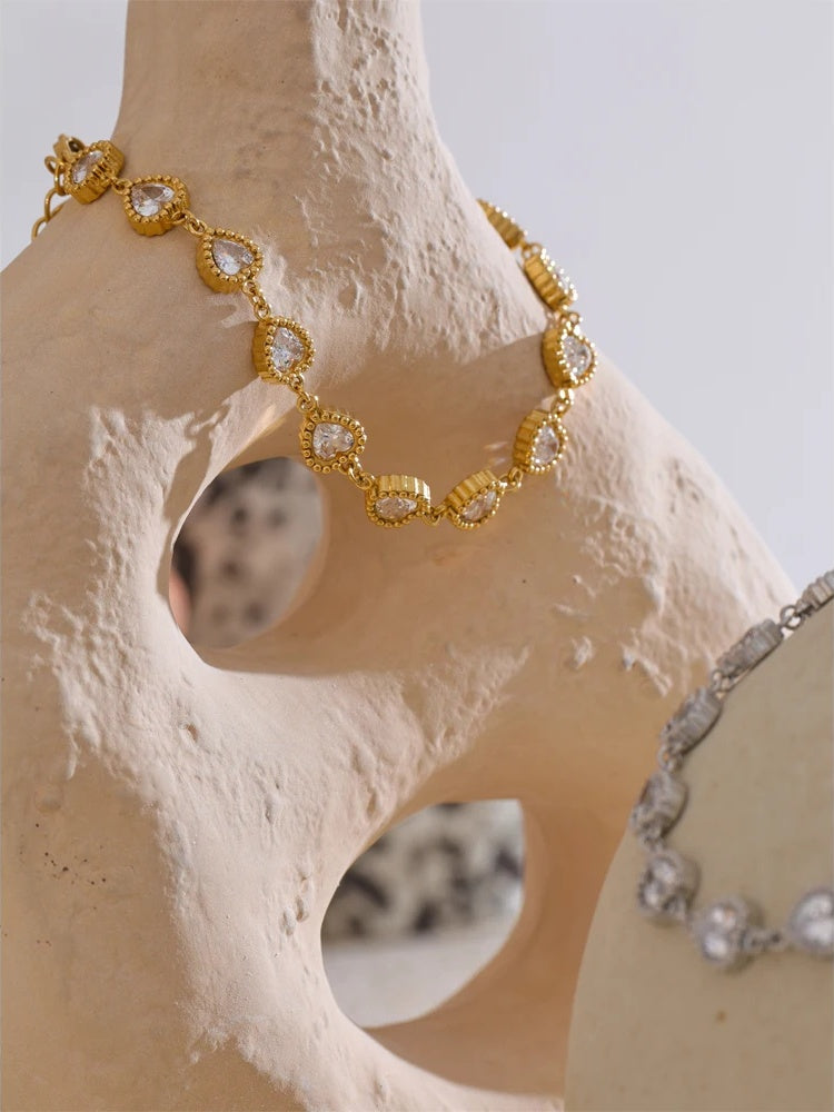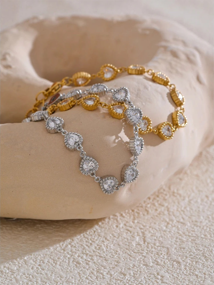 A delicate charm bracelet featuring heart-shaped cubic zirconia stones set in a stainless steel band with a polished finish. The bracelet is waterproof and designed with durable PVD real gold plating, ensuring long-lasting shine and resistance to wear. Equipped with a lobster-claw clasp and adjustable chain, it offers a secure and customizable fit for all wrist sizes. Suitable for everyday wear or as a thoughtful gift, it combines trendy style with reliable craftsmanship.