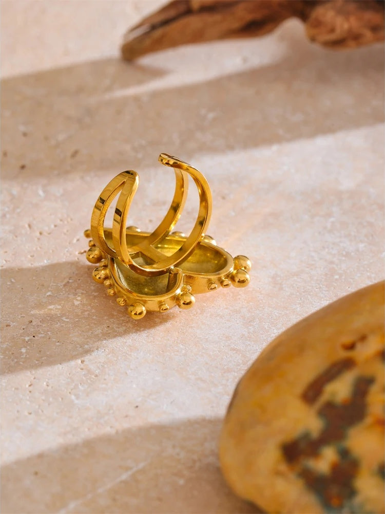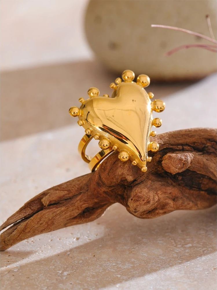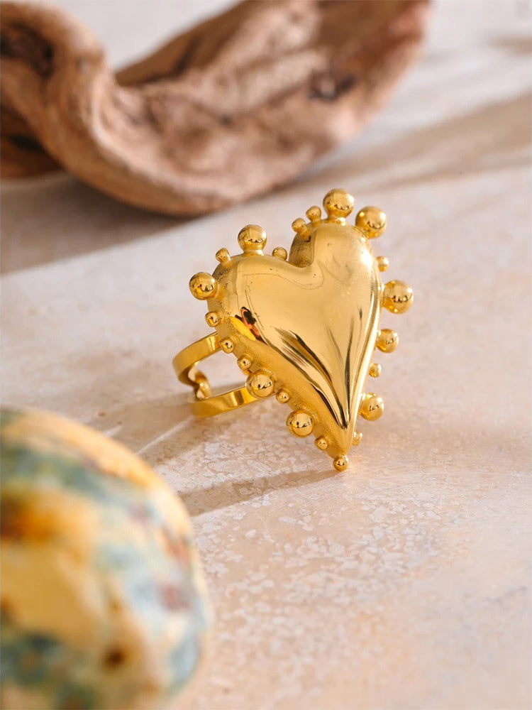 Elevate your everyday with a modern heart ring that balances charm and edge. Crafted from durable stainless steel and finished with 18K gold–color plating, this glossy centerpiece features petite spherical accents that catch the light from every angle—perfect for those who love a clean, sculptural look in their gold-plated jewelry.