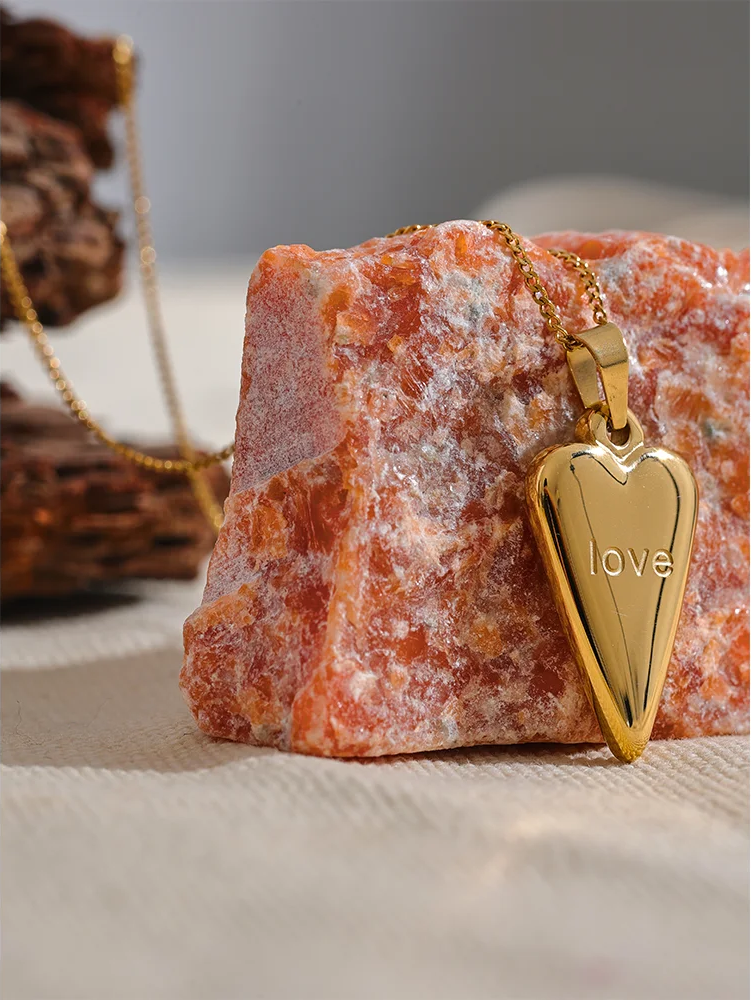 - Detail: Minimalist “love” engraving on a classic heart pendant