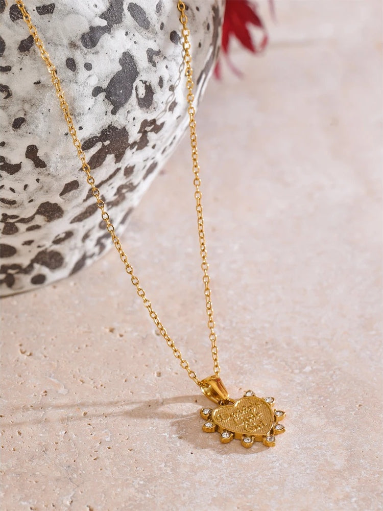 Crafted from stainless steel with a durable 18K PVD gold plating, this heart-shaped pendant necklace features sparkling cubic zirconia accents surrounding a textured center engraved with the phrase "Daddy's Little Girl." Designed to be waterproof and resistant to tarnish, it offers lasting shine and wearability. The pendant hangs on a finely linked chain, combining sentimental detail with contemporary fashion flair. Suitable for all occasions, it makes a meaningful gift option for celebrating the special bond between father and daughter.