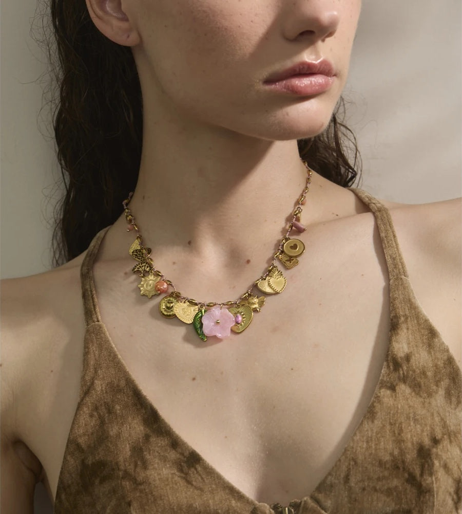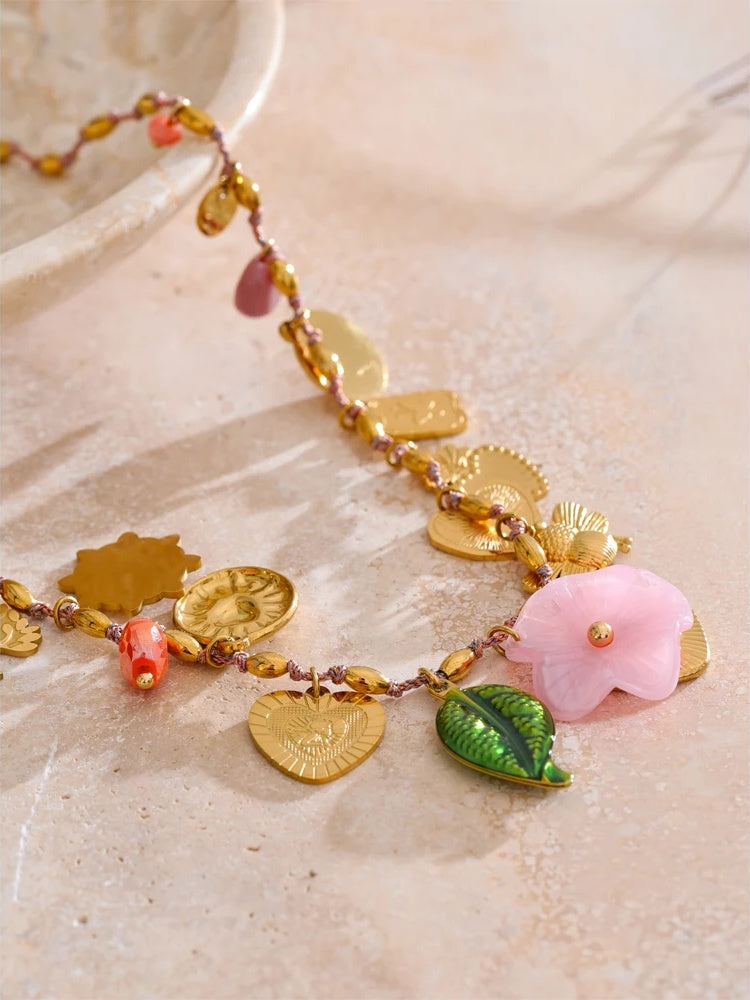 Crafted from stainless steel with a PVD real gold plating, this necklace features an array of charming pendants including hearts, flowers, and leaf motifs. The combination of metal and resin elements adds texture and vibrant color, creating a trendy, handmade aesthetic. Lightweight and suitable for all occasions, it offers a fashionable statement with a focus on nature-inspired design.