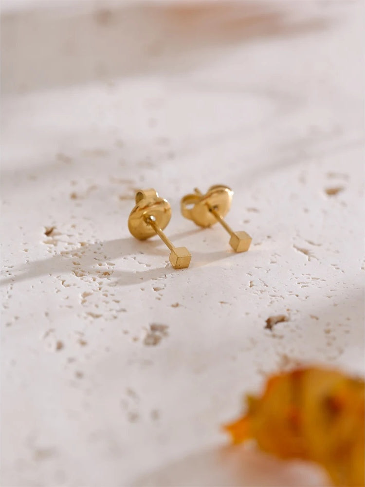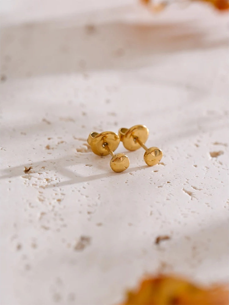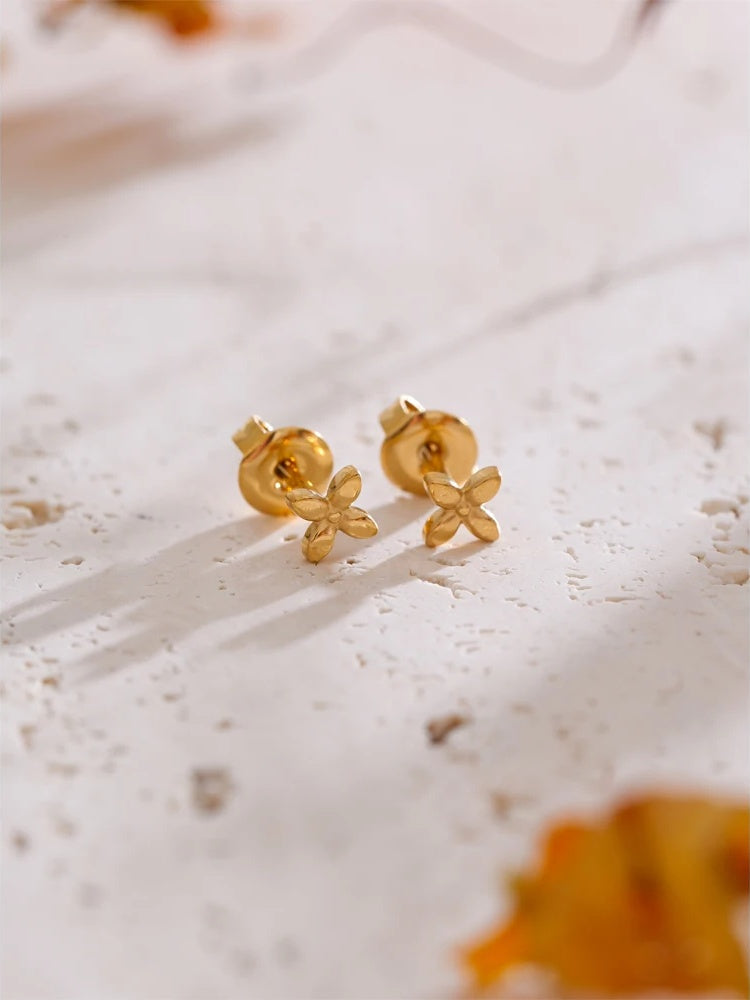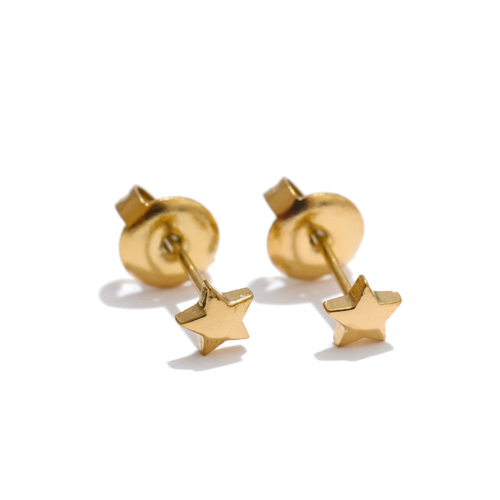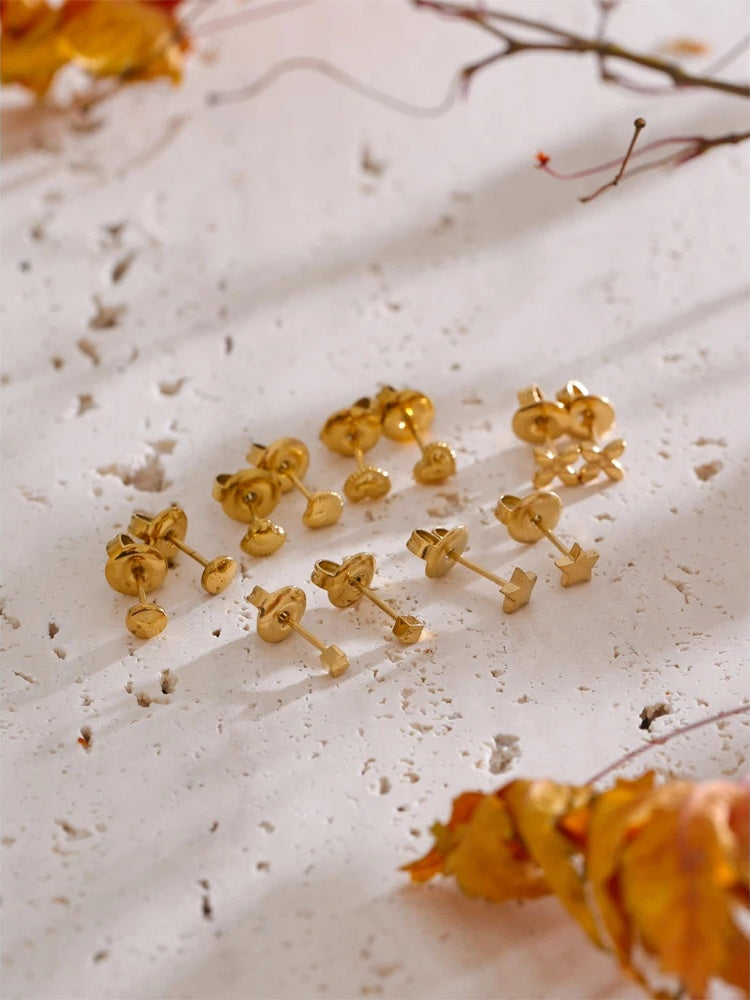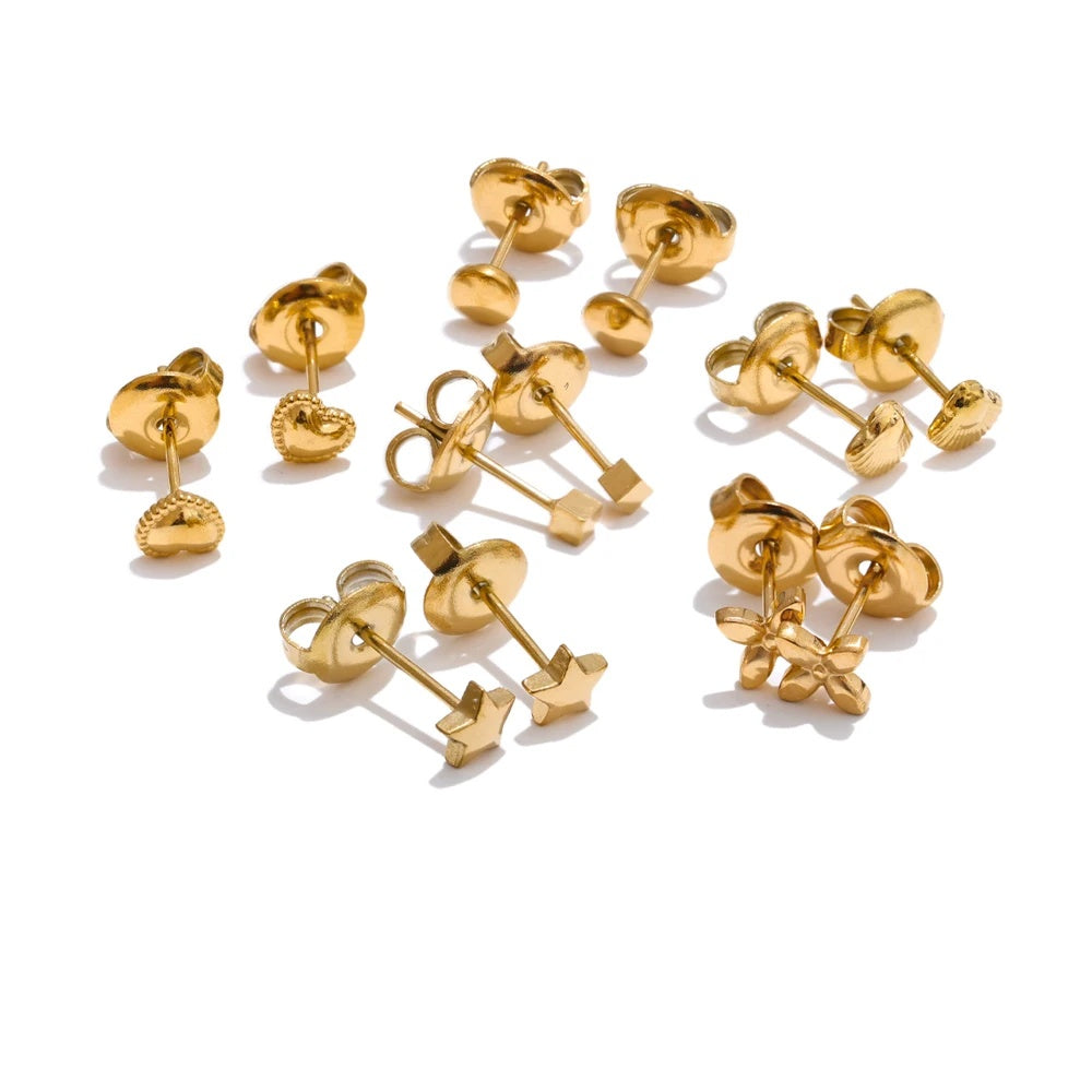 A versatile set of mini stud earrings crafted from stainless steel with a PVD real gold plating for a lasting shine. Featuring delicate heart, star, flower, and round designs, these lightweight earrings offer daily wear comfort with secure push-back closures. Their waterproof quality ensures durability, making them ideal for stacking or mixing and matching to suit any style.