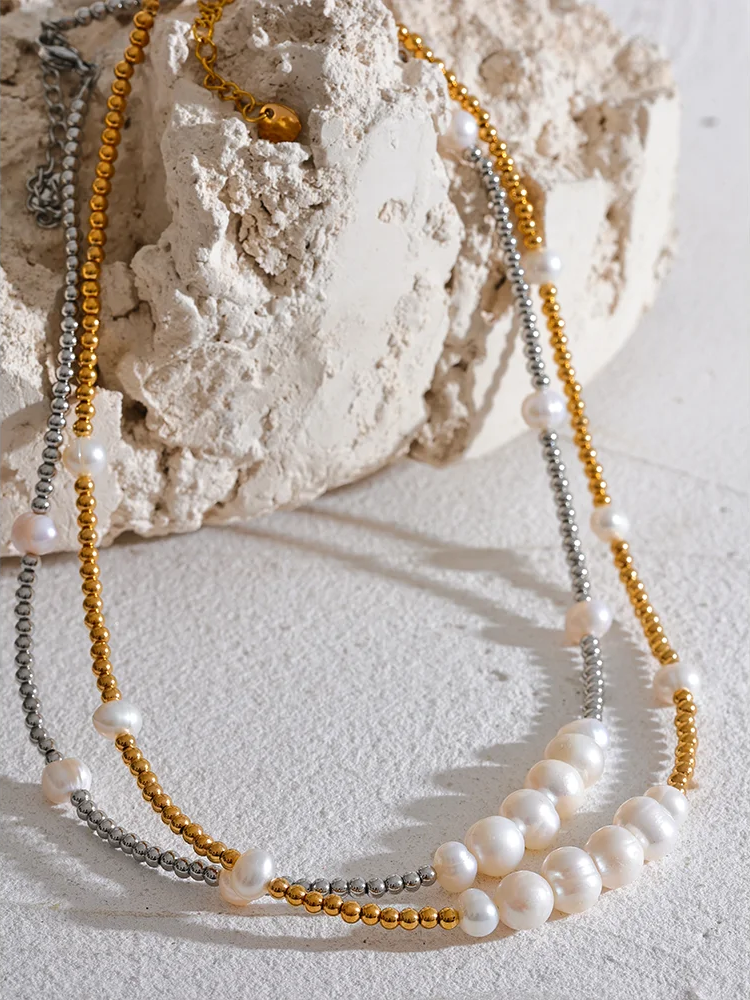 Elevate your everyday look with a handmade freshwater pearl necklace that balances modern geometry and timeless elegance. Smooth, polished pearls are artfully spaced with high‑grade stainless steel beads finished in PVD real gold, creating a luminous contrast that feels refined yet effortless.