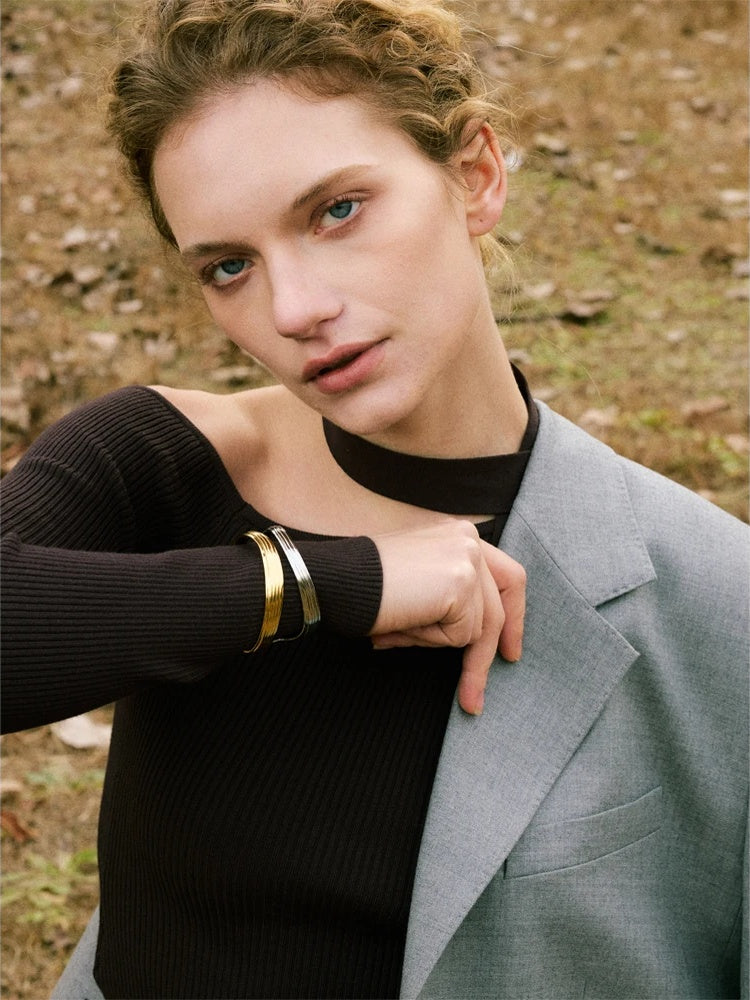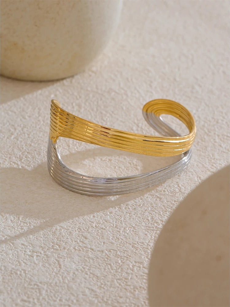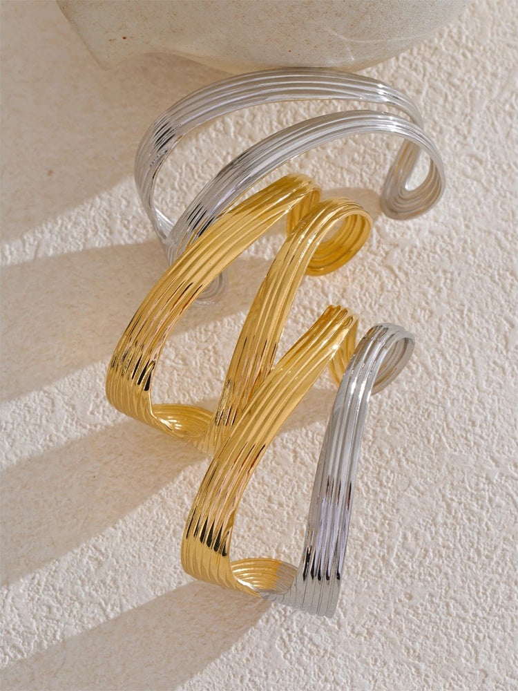 Meet your new everyday essential: a modern open cuff bracelet crafted in durable stainless steel and finished with a gold-color PVD coating for a long-lasting, gold-plated look. The hollow geometric silhouette balances sculptural curves with a fine ribbed texture, creating a minimalist statement that feels featherlight on the wrist.