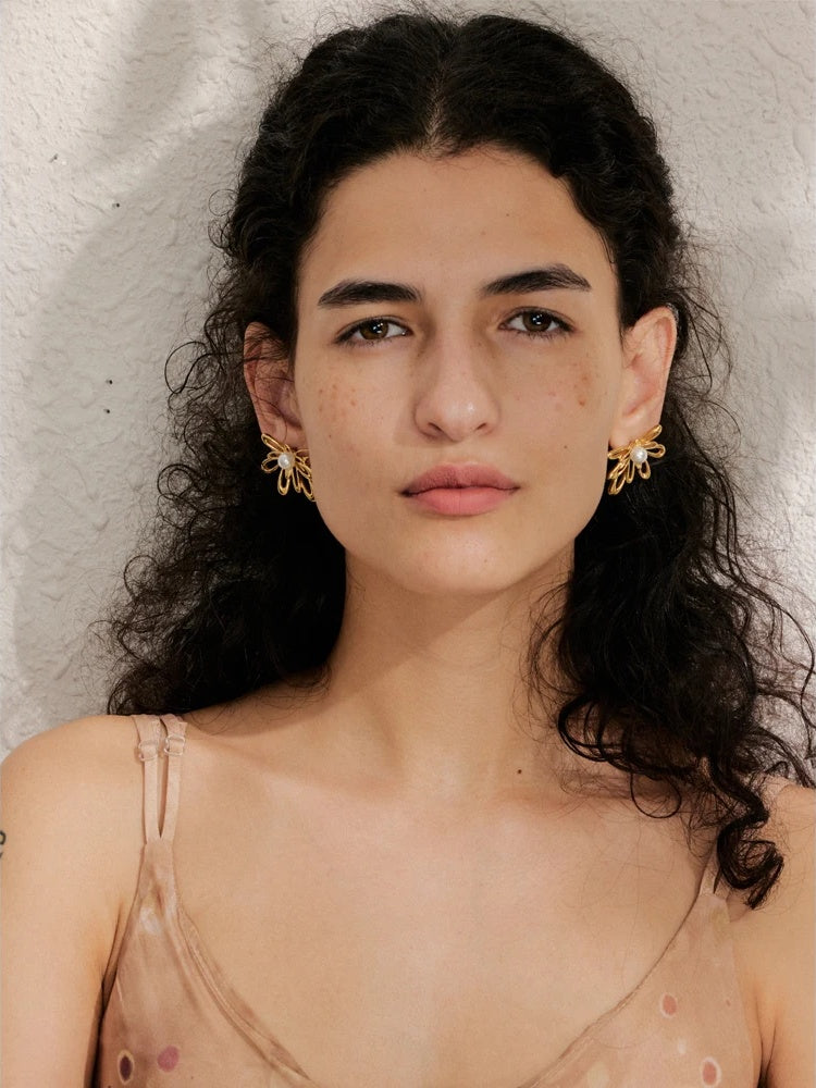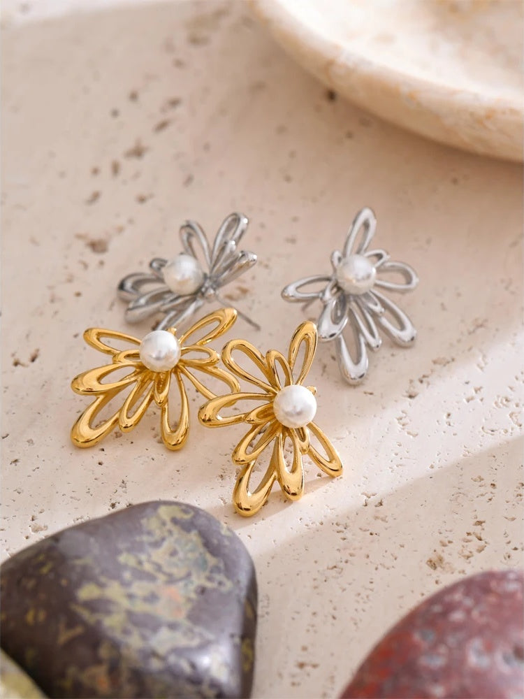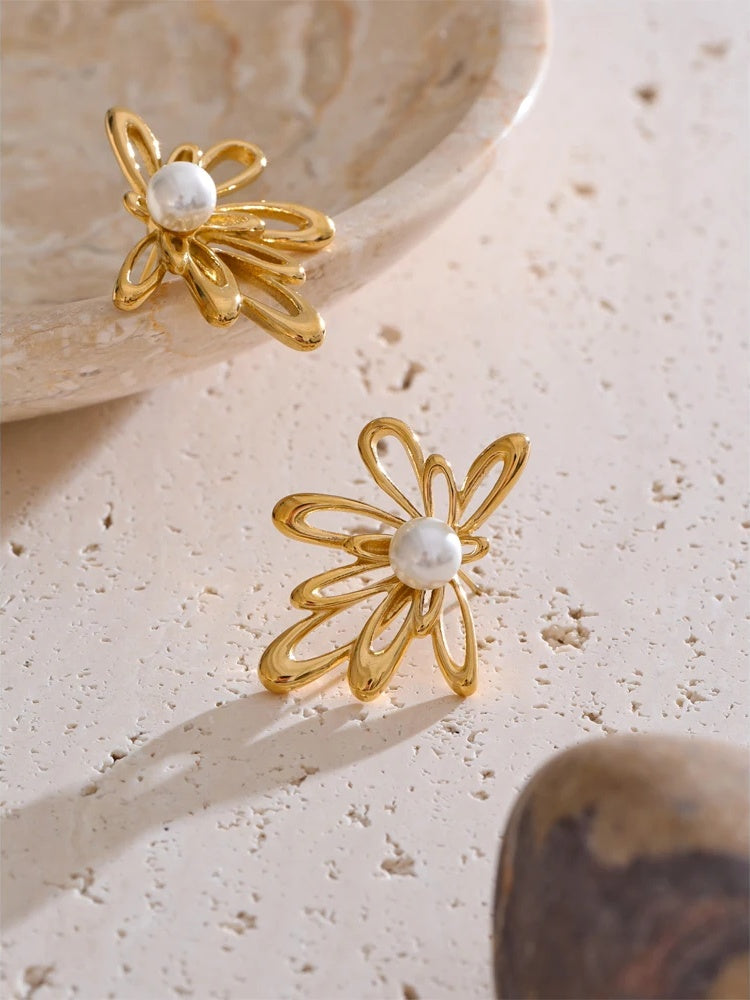 Elevate your everyday with these delicate floral stud earrings, thoughtfully crafted in hollow, flower-shaped stainless steel and finished with a luminous simulated pearl at the center. A durable PVD gold plating lends these gold-plated earrings their warm glow and lasting shine, while the lightweight silhouette offers comfort from morning to evening.