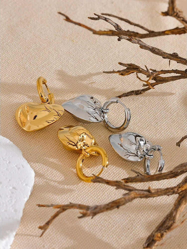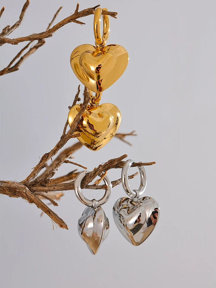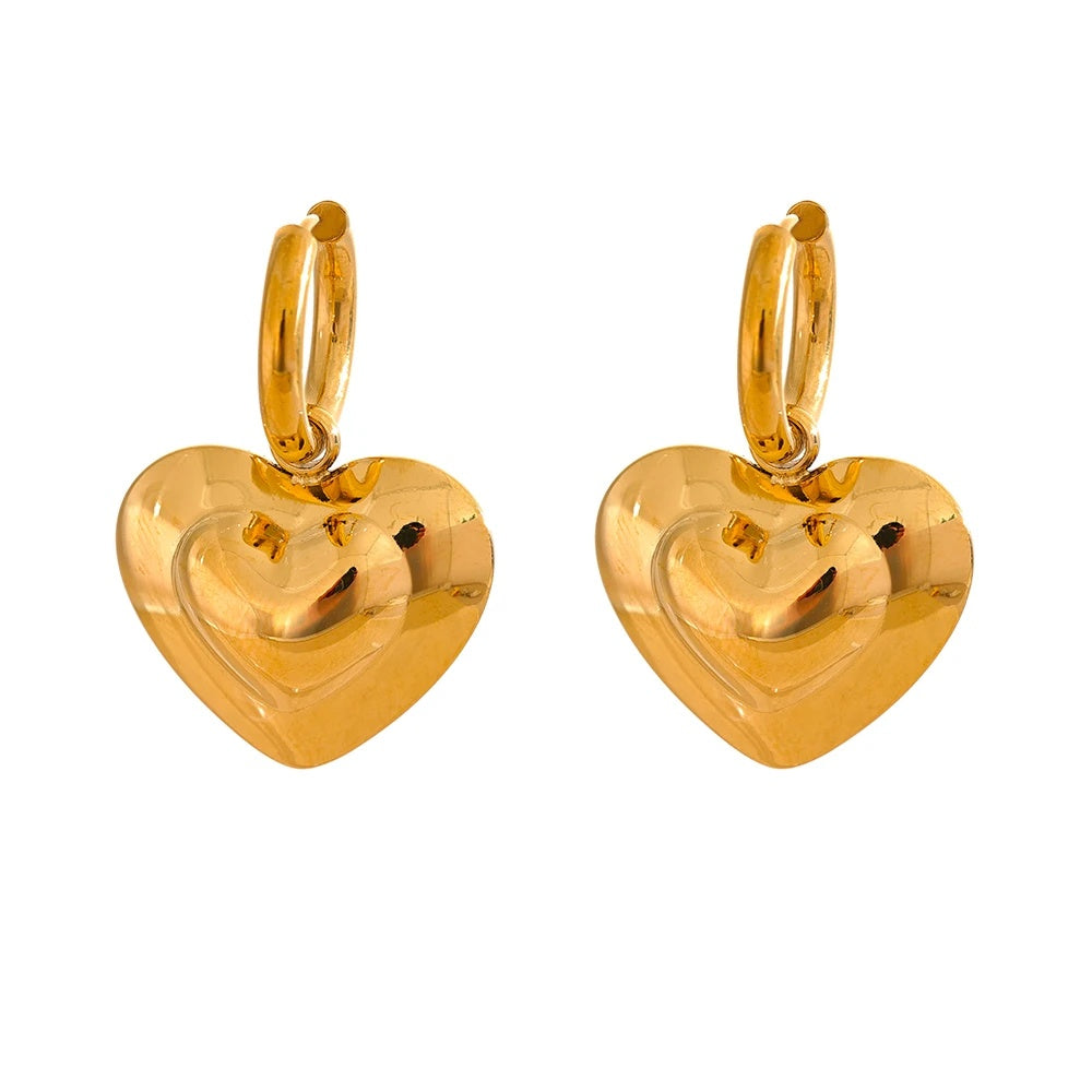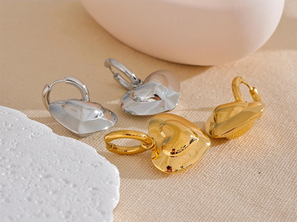 Crafted from stainless steel with a PVD real gold plating, these hoop earrings feature a smooth, hollow heart-shaped drop for a modern, three-dimensional effect. Designed to be waterproof and durable, they are suitable for everyday wear without losing their shine. The lightweight, trendy design combines elegance with subtle charm, making these earrings a versatile accessory for various occasions.