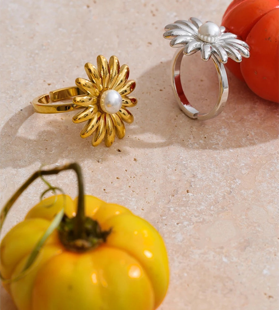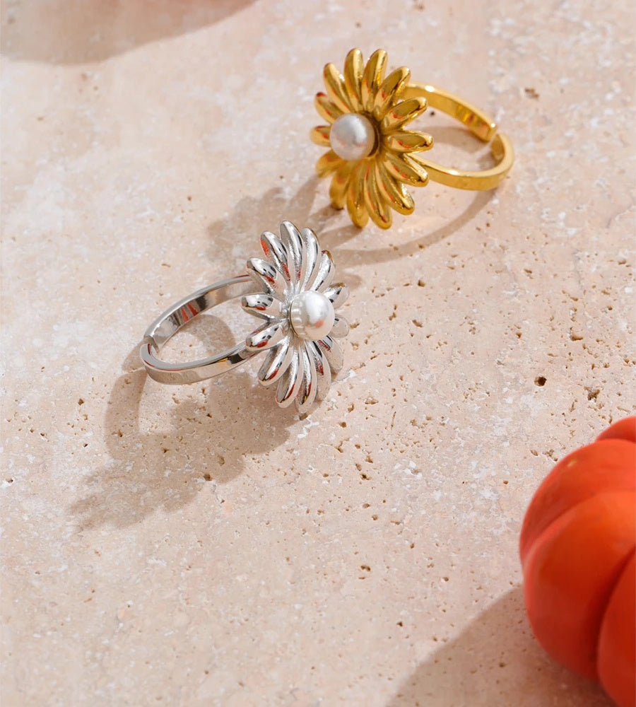 A sunflower-inspired ring featuring a lustrous imitation pearl at its center, crafted from durable stainless steel with a gold-toned PVD plating. The adjustable band ensures a comfortable fit for various finger sizes. Designed with a chic geometric pattern, this piece offers a trendy yet timeless look suitable for gifting or everyday wear.