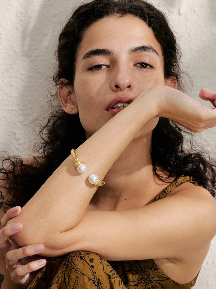 - Design: Open-ended cuff with a contemporary geometric pattern and smooth, round imitation pearls