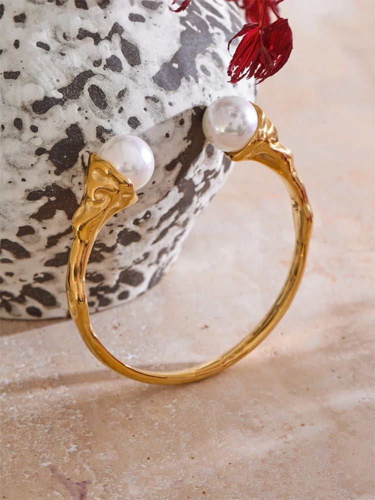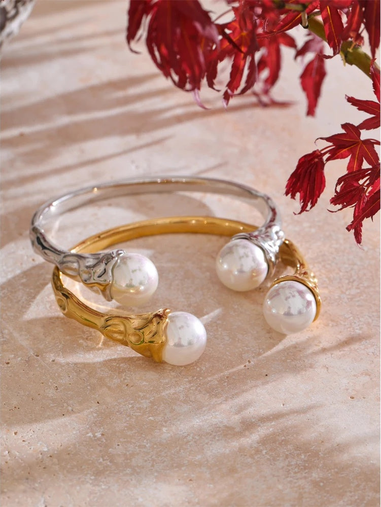 Elevate everyday style with a refined cuff that balances modern lines and timeless pearls. This polished stainless steel bracelet features perfectly round imitation pearls set against a sleek, geometric motif—an elegant contrast that suits both tailored looks and relaxed layers. Finished with durable PVD gold plating, it offers a rich, gold-tone shine designed for long-lasting wear.