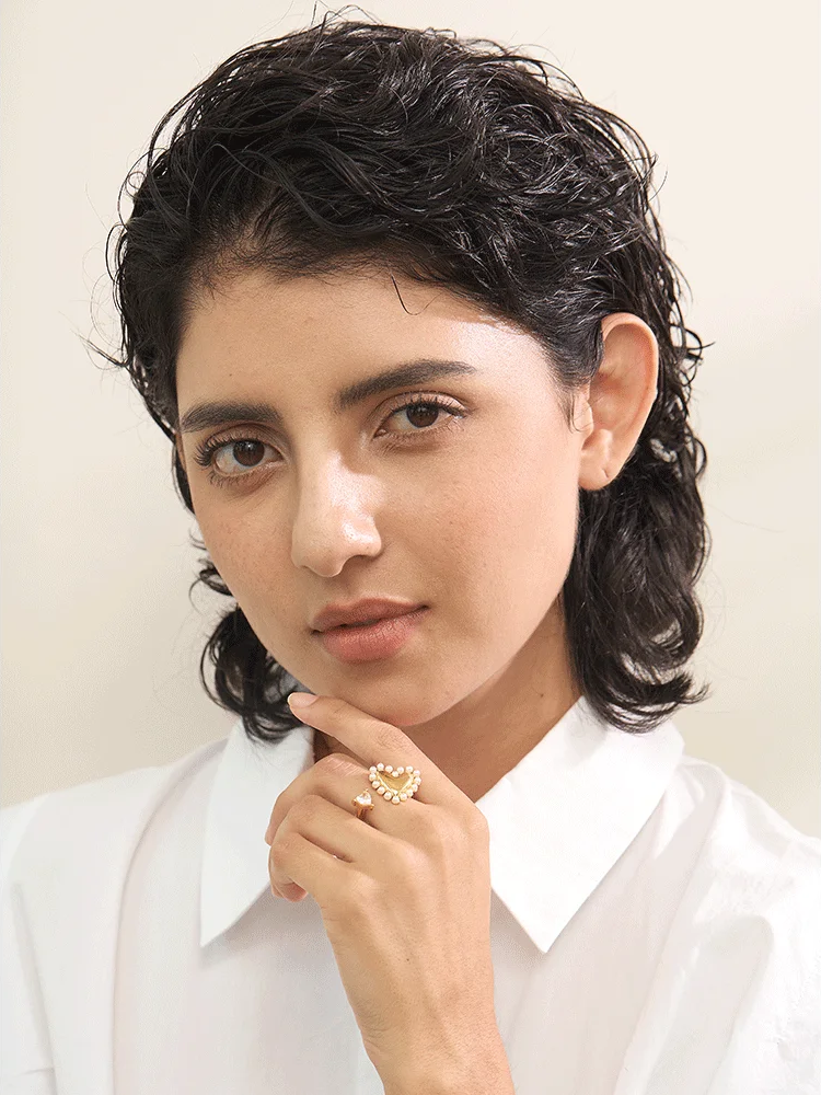 Crafted from stainless steel with 18k gold plating, this open ring features a heart-shaped design accented with imitation pearls and a sparkling cubic zirconia stone. The ring's water-resistant finish ensures durability, making it suitable for everyday wear. Its trendy style and elegant detailing make it a standout accessory for parties and special occasions.