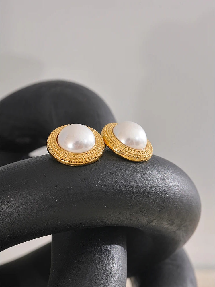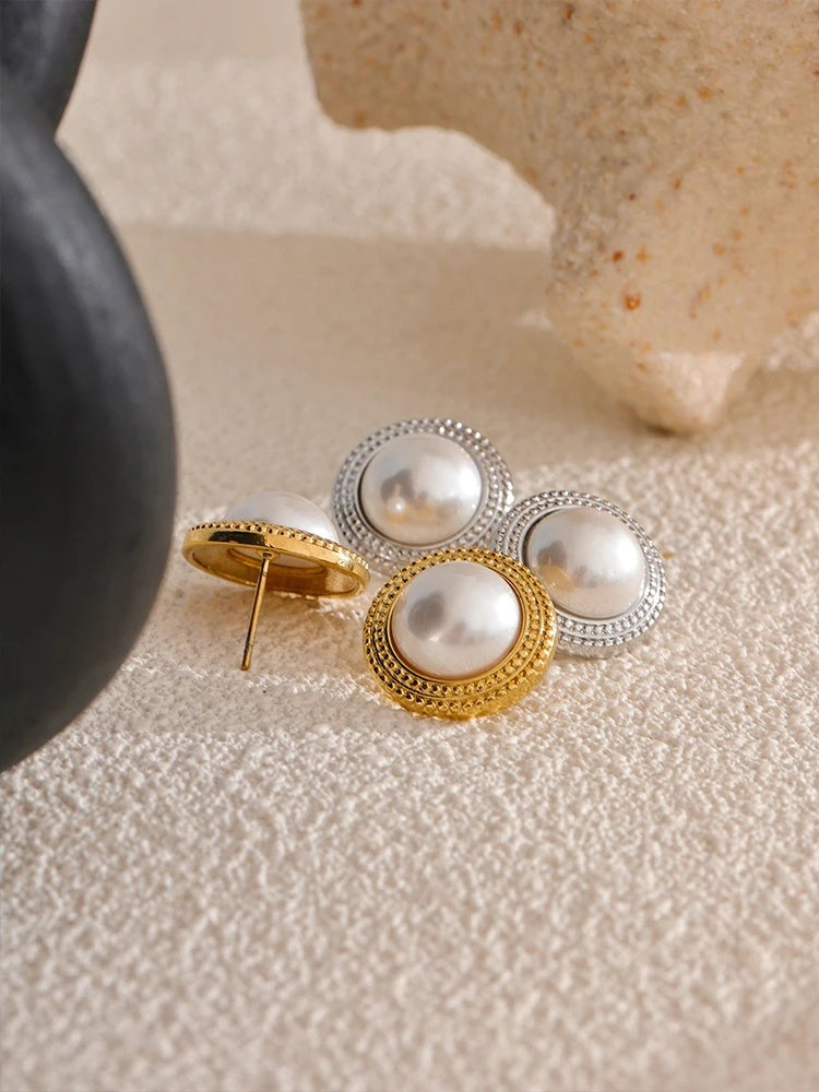 Round stud earrings featuring lustrous simulated pearls set in intricately detailed metal bases with a polished finish. Crafted from stainless steel with a PVD real gold plating, these earrings offer both durability and a sophisticated look. Designed with push-back closures for secure, comfortable wear, they are ideal for daily use and suitable for sensitive skin. Available in classic gold or platinum tones to complement various styles.